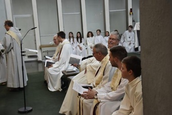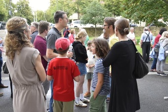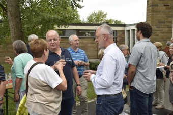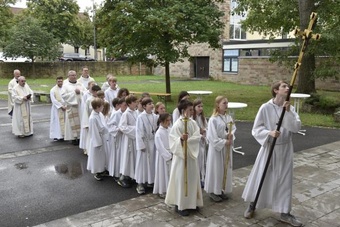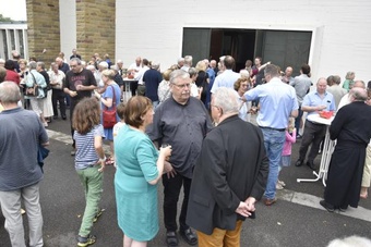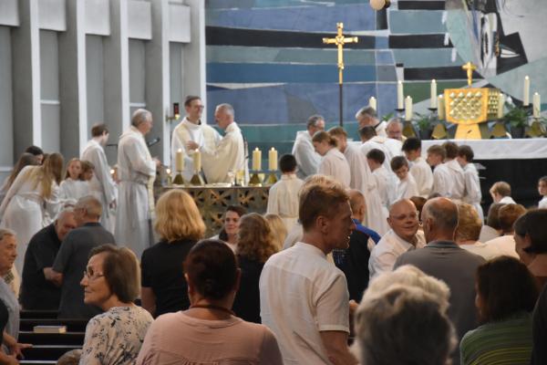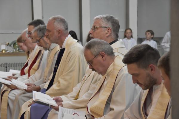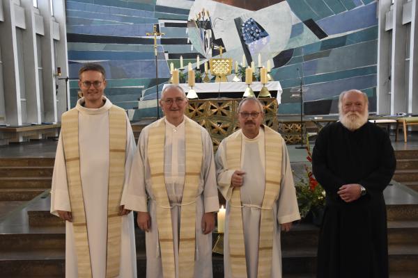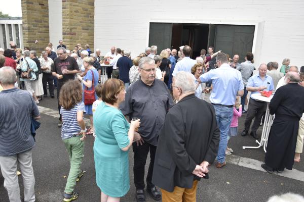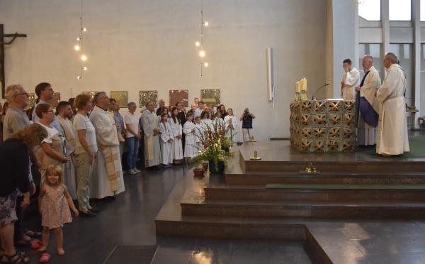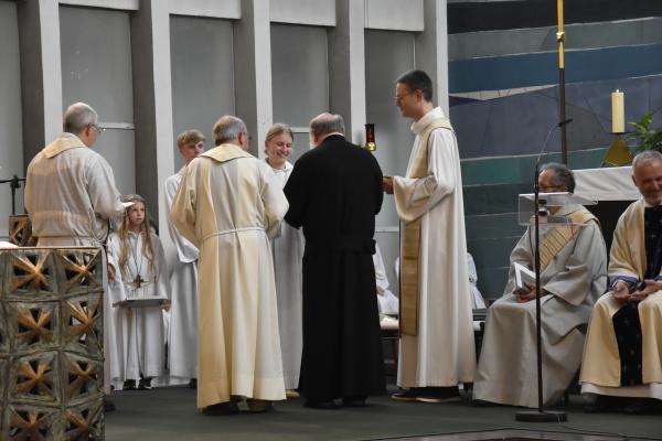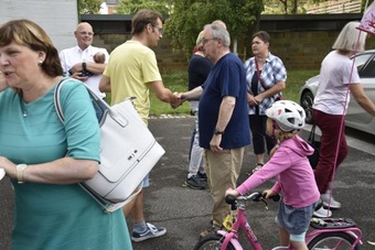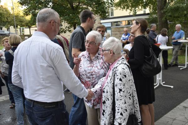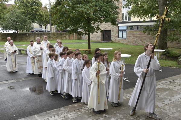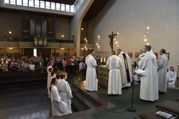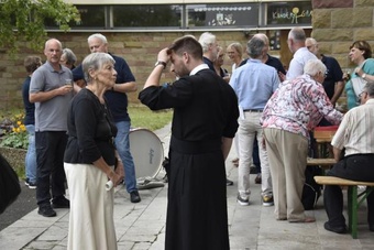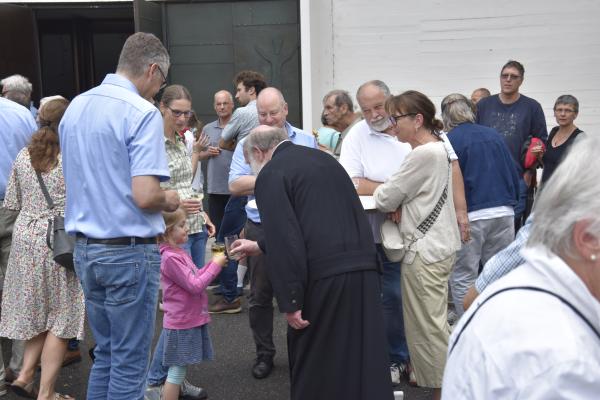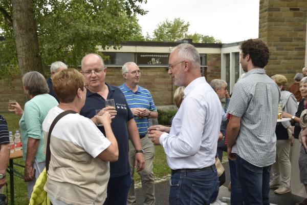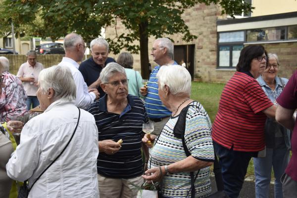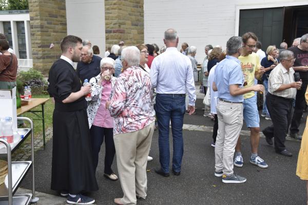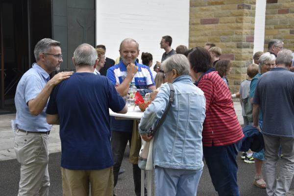 Ein anschließender kleiner Empfang auf dem Kirchplatz rückte dann wieder Dank und Nach-Vorne-Schauen ins Zentrum; auf die kurze Dankfomel von Gemeindemitgliedern (viele wollten noch einmal mit den Patres sprechen, man musste sich also kurz fassen … !), die Zeit der Redemptoristen in Würzburg sei einfach eine gute Zeit gewesen, antwortete Pater Fritz, es sei v.a. auch genau wegen der Gemeinde(n) und der vielen Engagierten eine gute Zeit gewesen … Es waren am 1. August 2024 nicht nur viele da – Gemeindeglieder aus der gesamten Pfarreiengemeinschaft Würzburg Ost, aber auch viele Gäste –: Nicht zuletzt mit mitfeiernden Diakonen, 20 Ministrantinnen und Ministranten und dem Bläserensemble Heilichs Blechle konnten wir zeigen, dass mit uns zu rechnen ist. Und auch die zuversichtliche Unbeschwertheit bei Silvaner oder Bacchus vermittelte die Entschlossenheit, als Katholiken auf der Keesburg und in der Pfarreiengemeinschaft – mit einem neuen Team unter Pfarrer Johannsen – hoffnungsvoll in die Zukunft zu gehen.