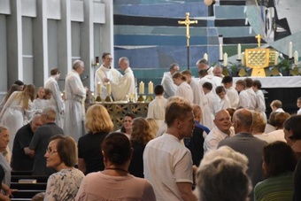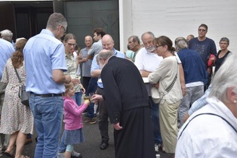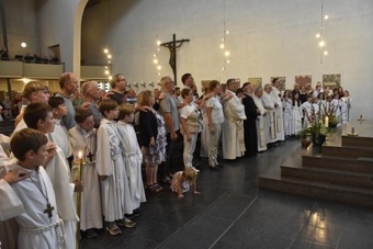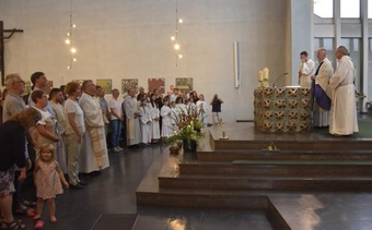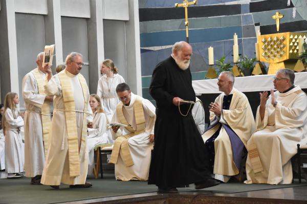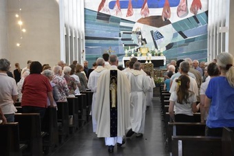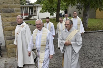 Obwohl in den einzelnen Gemeinden der PG Wü-Ost die offiziellen Abschiedsgottesdienste der Redemptoristen jeweils schon bei den Pfarrfesten gefeiert wurden, war der Abschied des Ordens auch zum Patrozinium wieder unvermeidliches Thema – verbunden v.a. mit Dankbarkeit, aber auch einem zuversichtlichen Blick nach vorne. Besonders schön war die Form des Segens, bei der die Segensworte von Pater Leitgöb an die scheidenden Redemptoristen Pater Fritz, Pater Bernd, Pater Martin und Bruder Gerhard verstärkt wurden von der durch Handauflegung über Ketten gewissermaßen übertragenen spirituellen Energie aller Mitfeiernden. Nach diesem außergewöhnlichen Segen verließen nicht wenige mit Tränen in den Augen und berührt die Kirche.
