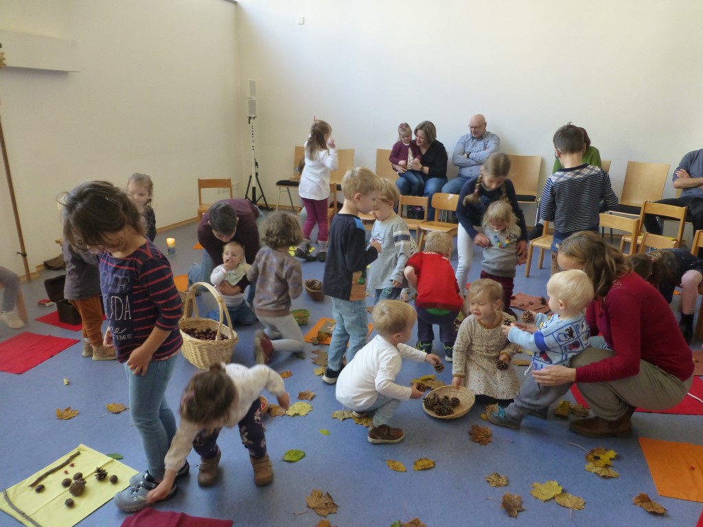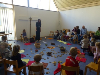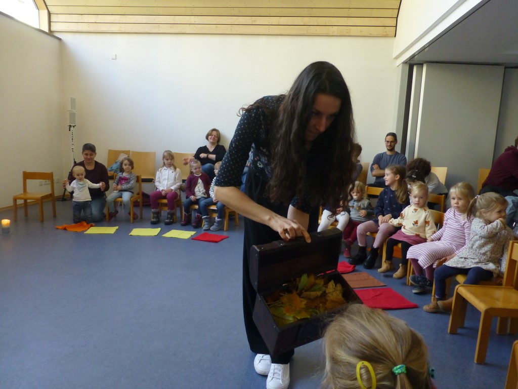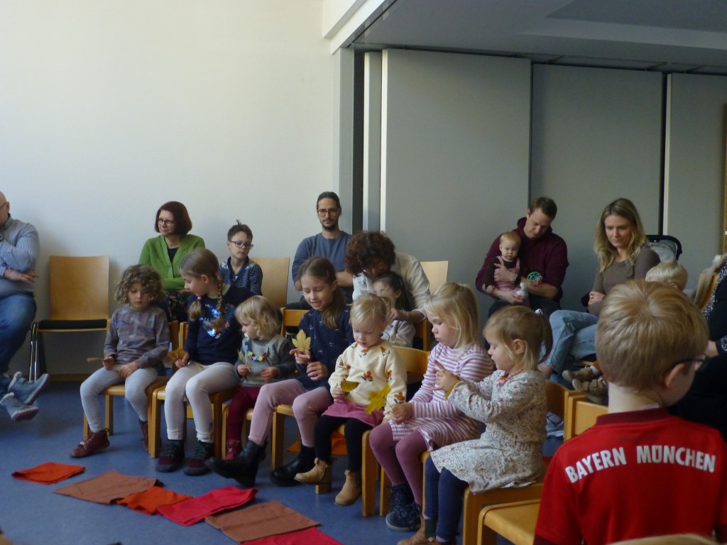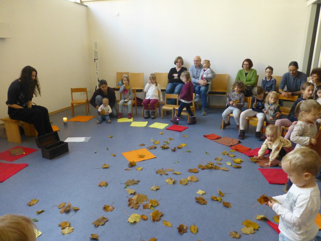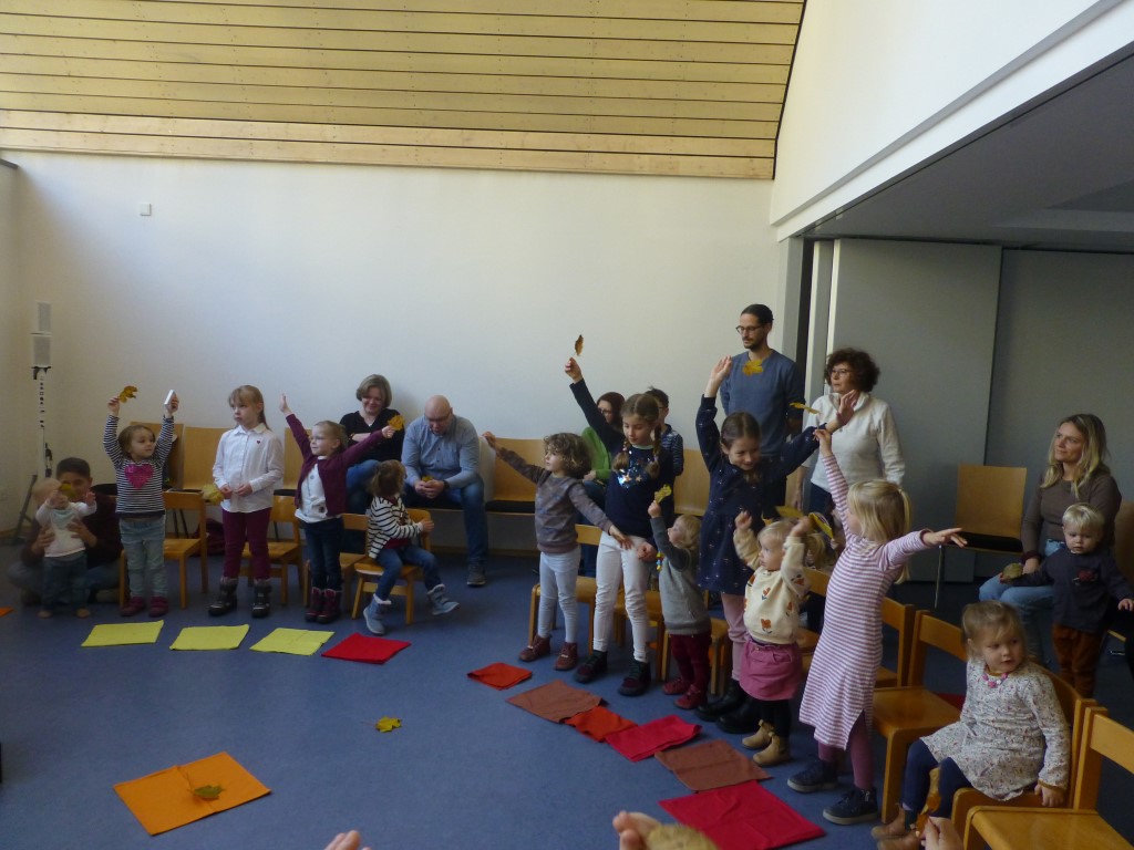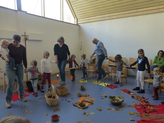 Der Herbst - fallen - vergehen - alles im Leben hat seine Zeit. Zu diesem Thema trafen wir uns im vollgefüllten Pfarrzentrum mit Kindern und Familien. Um den Herbst mit all seiner Schönheit in unsere Mitte zu holen, legten die Kinder bunte Tücher in die Kreismitte. Eine Schatzkiste vollgefüllt mit farbigen Blättern bekam ihren Mittelpunkt und jeder durfte sich ein Blatt aussuchen. Das Blatt erzählte seine eigene Geschichte, vom Wachsen und kräftigem satten Grün, vom Schatten, den alle Blätter des Baumes spenden, vom Herbst und loslassen ... bis der Winter kommt. Jeder durfte nun selbst zum Baum werden ... und alles nachempfinden.