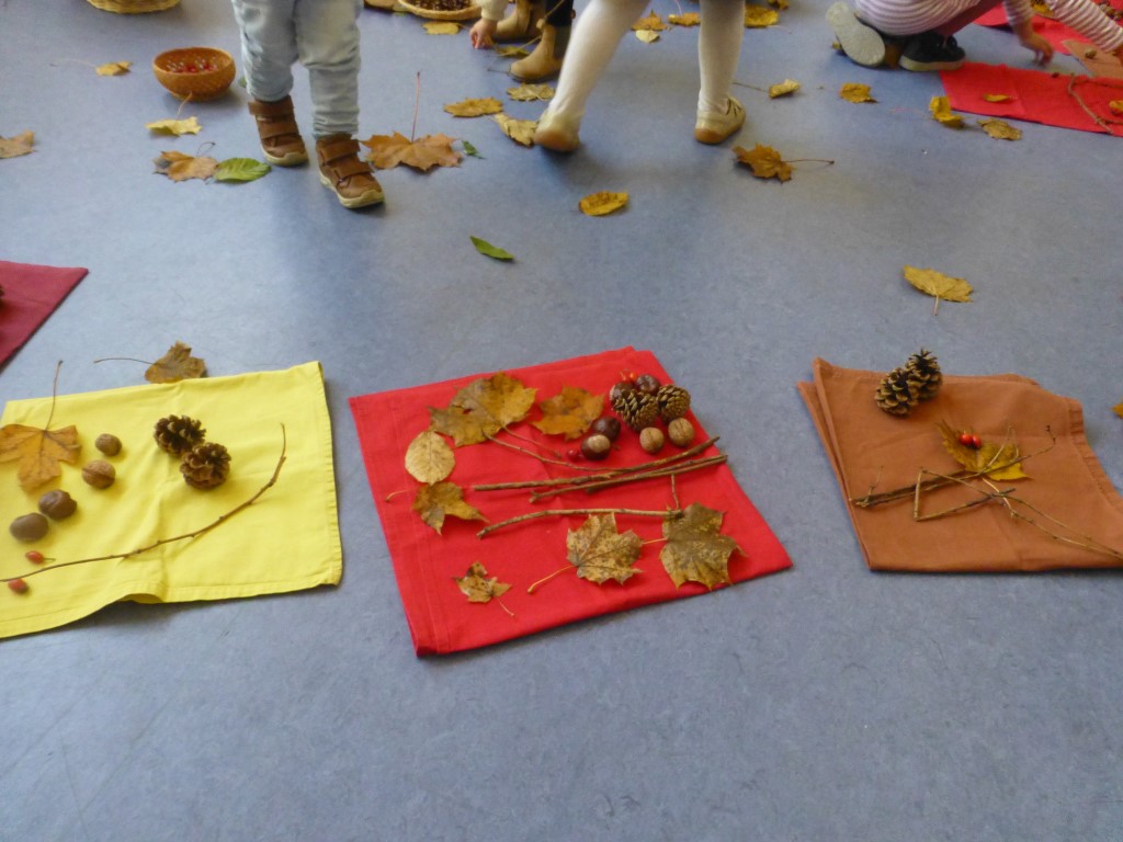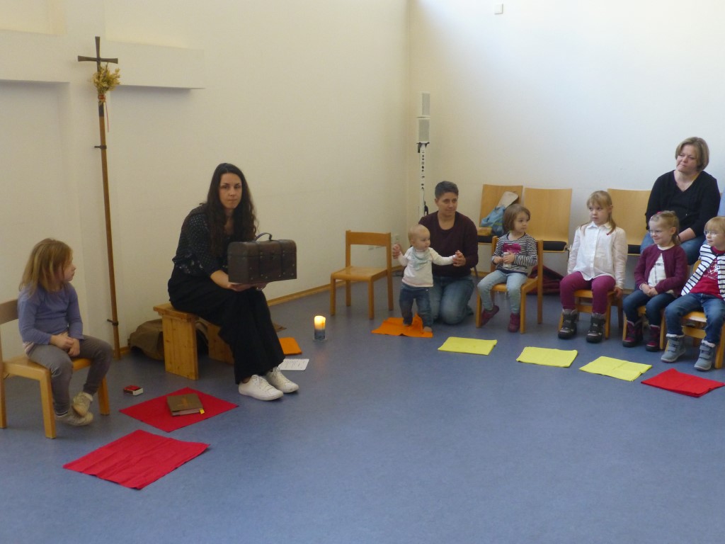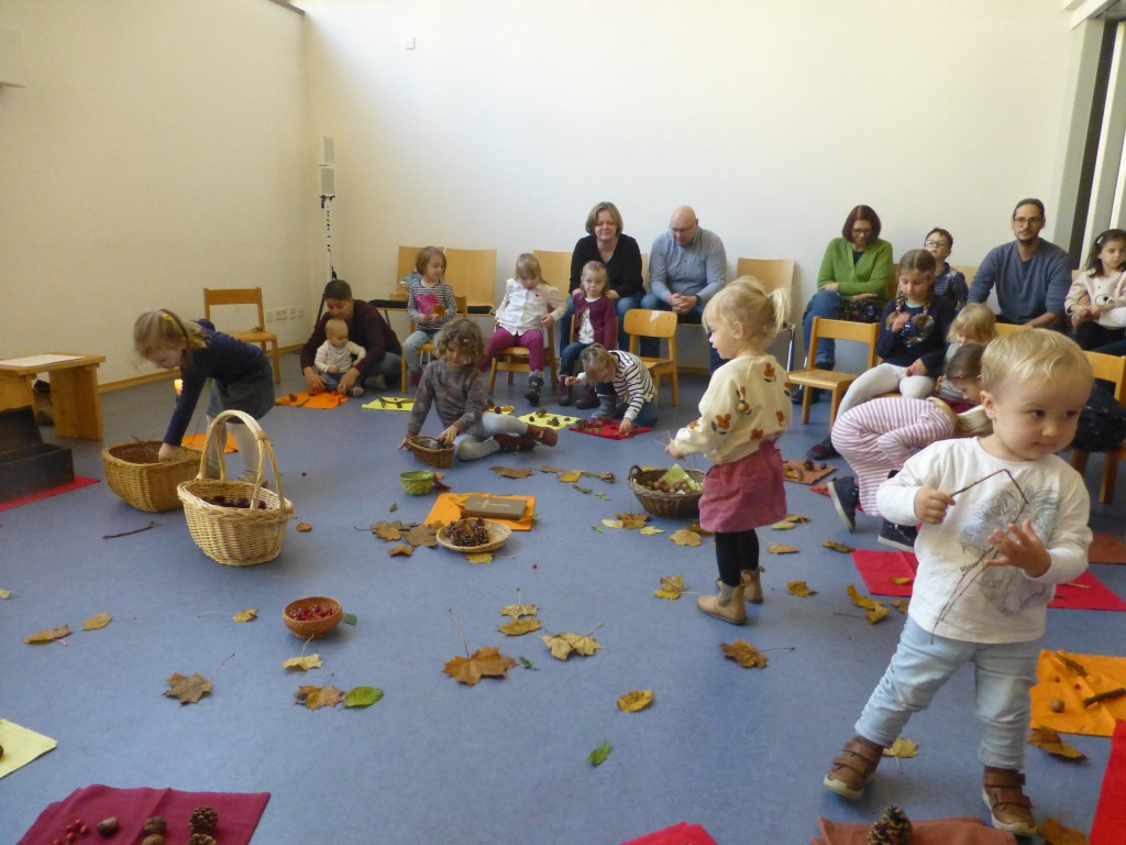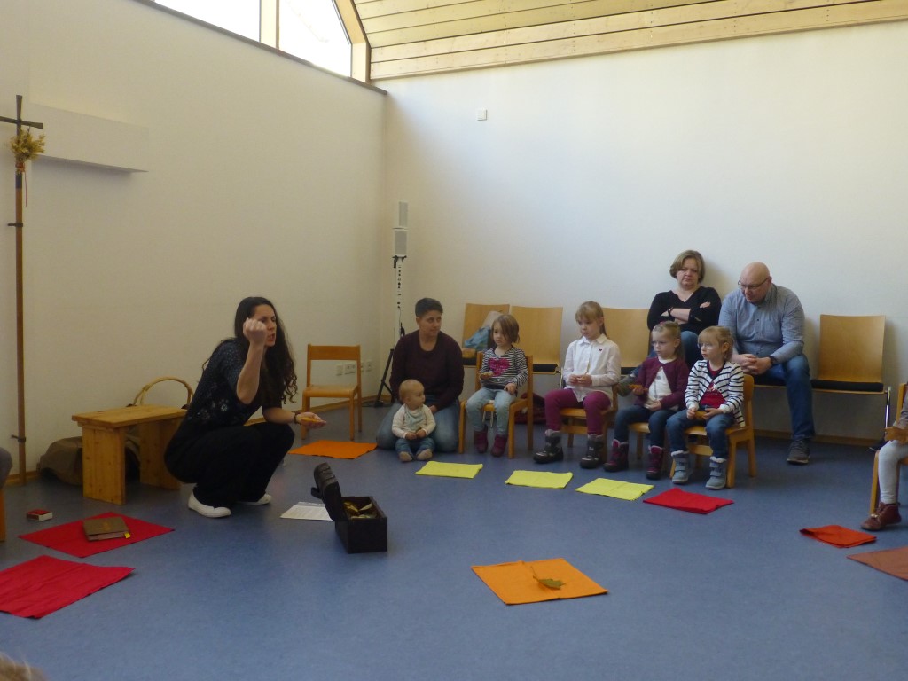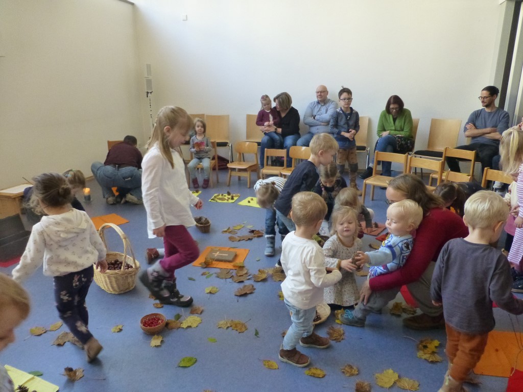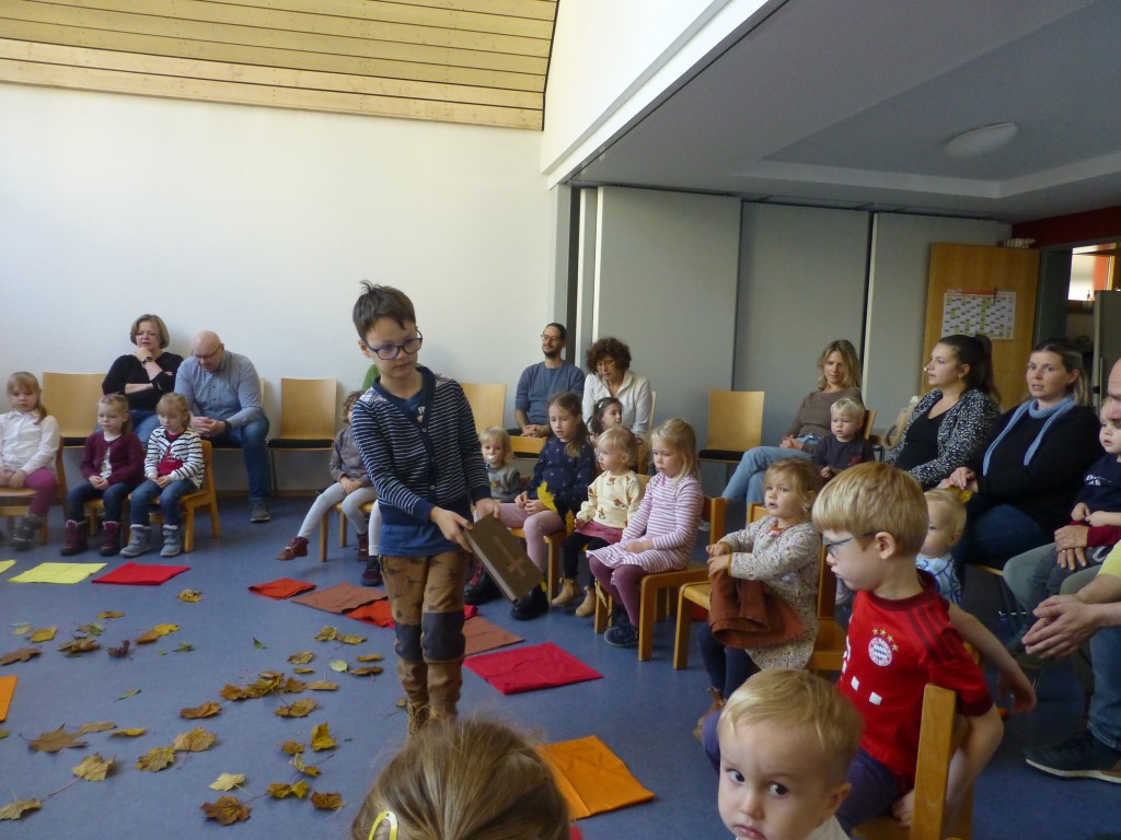 Der Herbst - fallen - vergehen - alles im Leben hat seine Zeit. Zu diesem Thema trafen wir uns im vollgefüllten Pfarrzentrum mit Kindern und Familien. Um den Herbst mit all seiner Schönheit in unsere Mitte zu holen, legten die Kinder bunte Tücher in die Kreismitte. Eine Schatzkiste vollgefüllt mit farbigen Blättern bekam ihren Mittelpunkt und jeder durfte sich ein Blatt aussuchen. Das Blatt erzählte seine eigene Geschichte, vom Wachsen und kräftigem satten Grün, vom Schatten, den alle Blätter des Baumes spenden, vom Herbst und loslassen ... bis der Winter kommt. Jeder durfte nun selbst zum Baum werden ... und alles nachempfinden.