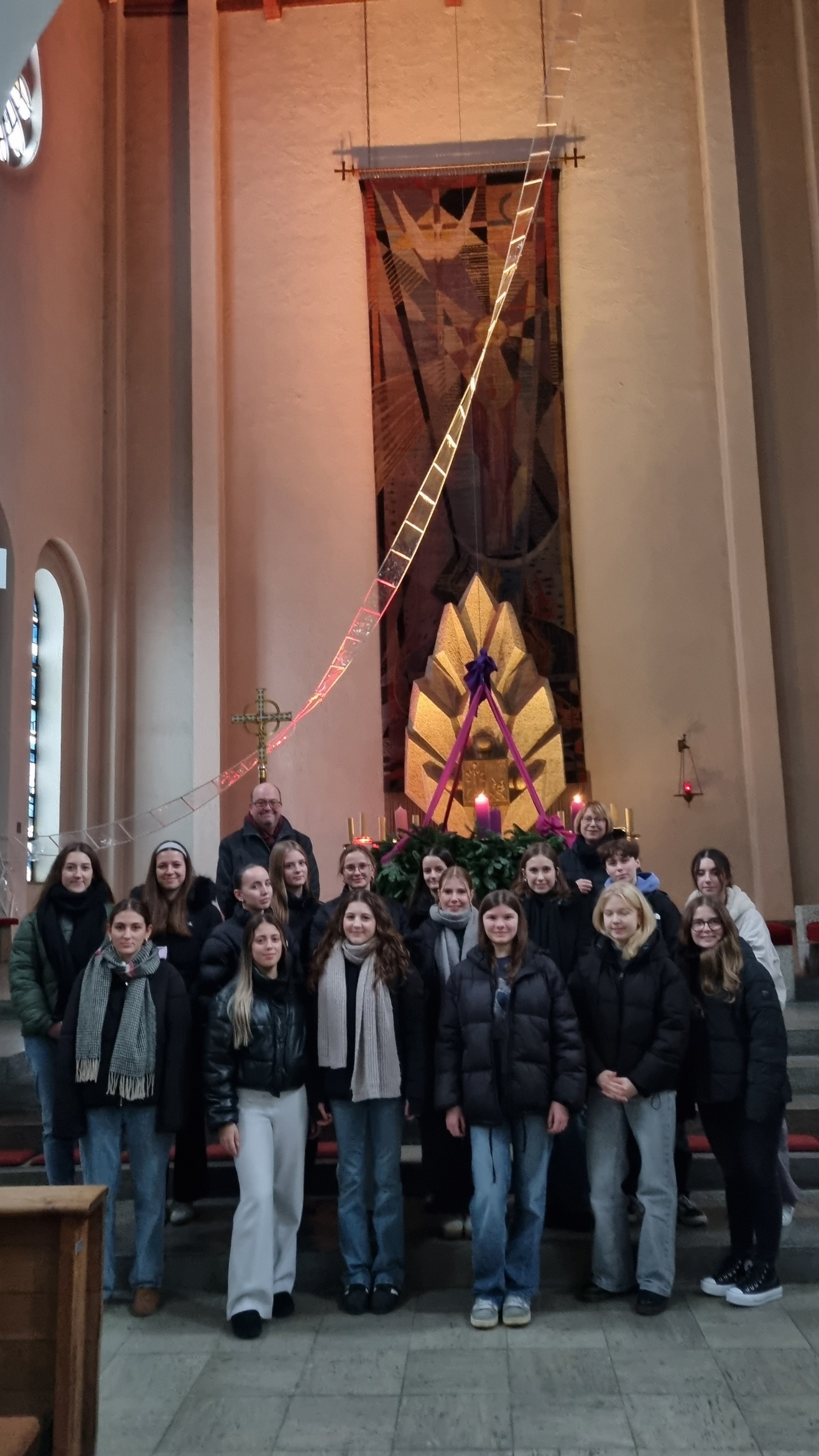 In diesem Jahr begleitet die Pfarrgemeinde ULF das Symbol der „Leiter zwischen Himmel und Erde“ durch die Advents- und Weihnachtszeit. Schülerinnen der Q12,2 (G9) der St. Ursula Schule Würzburg schufen mit ihrer Lehrerin Anne-Rose Volk eine eindrucksvolle Installation, die diese biblische Vision greifbar werden lässt. Diagonal durch den 16 Meter hohen Chorraum der Pfarrkirche Unsere Liebe Frau im Würzburger Frauenland zieht sich eine große Strickleiter, die von den Schülerinnen mit weißem Papier und Folie überzogen wurden, so dass sie bei Lichteinfall in gotischem Farbenglanz strahlen.