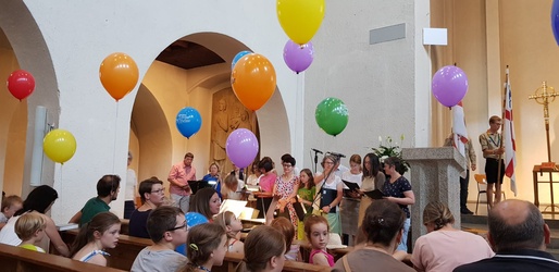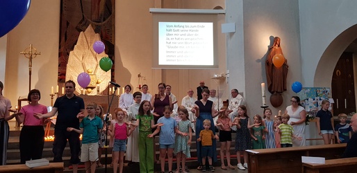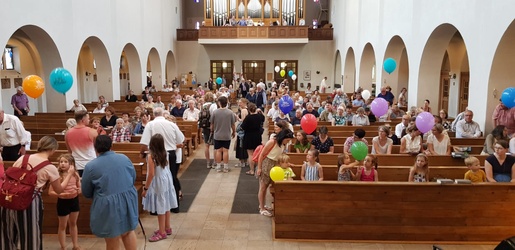 Nicht traurig, sondern bunt und voller Wertschätzung sollte der Gottesdienst für unseren Klaus Heßdörfer werden, so wie wir alle Klaus immer erleben durften. Trotzdem sind alle voller Trauer, über die große Lücke die Diakon Klaus hinterlässt. Verschiedene Gruppierungen hatten den Gottesdienst vorbereitet und in allen Worten kamen seine Herzlichkeit, große Hilfsbereitschaft, sein Humor, seine Lebensfreude zum Ausdruck. Er hinterlässt seine ganz eigenen Spuren. Beispielsweise sah man viele bunte Luftballons, die die Kinder in den Händen hielten. Es war für Klaus immer eine besondere Freude mit den Kindergartenkindern an ihrem Abschiedsfest Luftballons mit Wünschen in den Himmel steigen zu lassen.