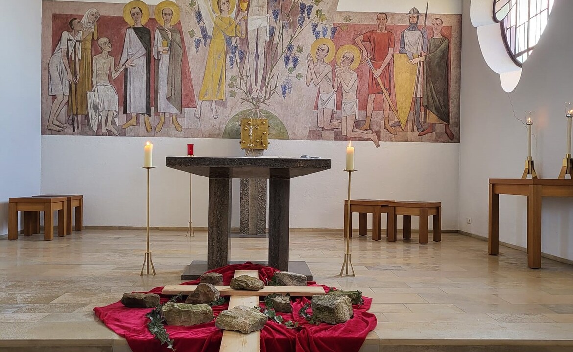 Um das Motto zu veranschaulichen, lag ein großes Holzkreuz bestehend aus 2 ungeschliffenen Holzbrettern vor dem Altar und zudem viele verschieden große Steine.
