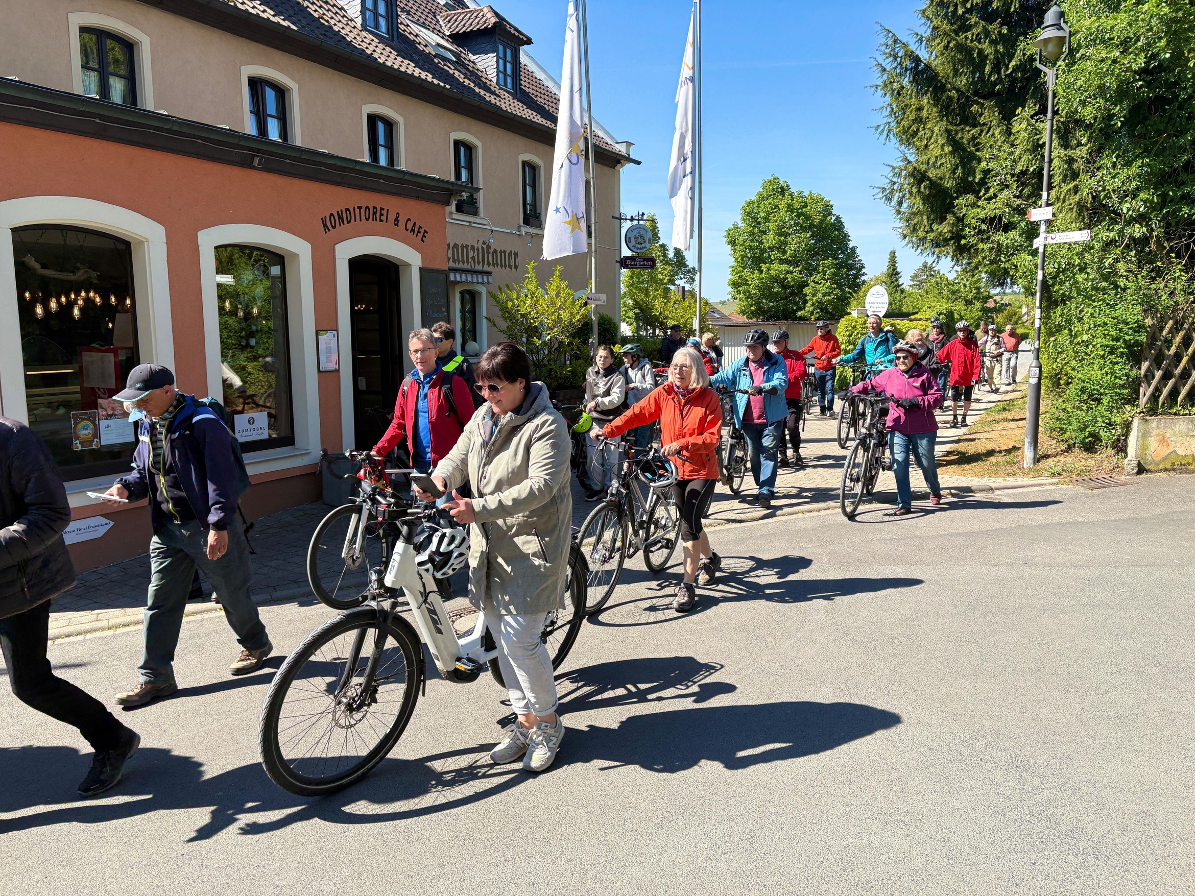 Etwas später machten sich auch die Rad-Wallfahrer auf den Weg. Die erste Raststation gab es am Rottendorfer Käppele, das frisch renoviert in vollem Glanz erstrahlte. Hier gab es eine kleine Meditation zu unserer wunderbaren Schöpfung. Alle genossen die farbenprächtige Natur durch die Fluren. In Effeldorf stimmten die Radpilger ein Marienlied an und hofften in Dettelbach auf die Fußpilgerschar zu treffen, was in diesem Jahr perfekt klappte.