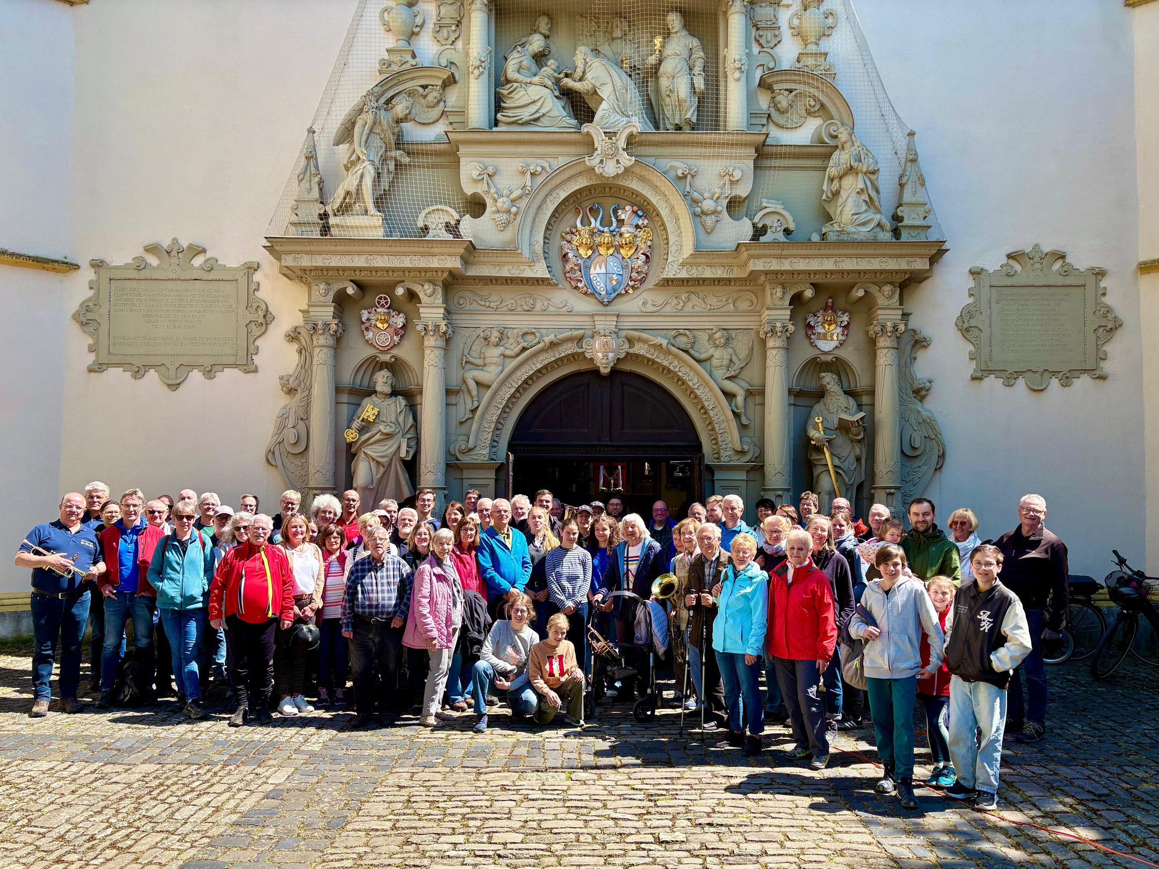 Ob zu Fuß, mit dem Rad oder mit dem Auto, alle Pilger waren am Samstag, 10. Mai auf dem Weg zur Wallfahrtskirche „Maria im Sande“ in Dettelbach. Bei strahlendem Sonnenschein, aber klirrender Kälte brach die erste Gruppe der Fußwallfahrt am neuen Friedhof in Gerbrunn auf und zog motiviert von aufmunternden Klängen der Bläser von „Heilichs Bleche“ dem neuen Tag entgegen. Im Heiligen Jahr 2025 standen die Texte unter der Überschrift „Pilger der Hoffnung“. Erfreulich war die Zahl von jungen Teilnehmern schon zu Beginn des Wallgangs. Durch die in satten Farben leuchtende Natur ging es mit flotten Schritt zum Treffpunkt mit den Wallfahrern aus Rottendorf, die schon seit dem 17. Jh. die Tradition der Dettelbach-Wallfahrt pflegen. Dort übernahmen die Vorbeter der Gemeinde St. Vitus die Texte und stellten den Blick auf die Schöpfung und den Frieden in den Mittelpunkt. Im Sportheim Effeldorf durften die „Läufer“ rasten und bestens versorgt frühstücken.
