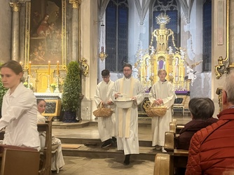 Am Gründonnerstagabend war die Gemeinde eingeladen, das letzte Abendmahl mitzufeiern. Zwölf, der älteren Ministranten zogen zusätzlich mit in den Gottesdienst ein. Seit vielen Jahren ist es Brauch, dass den Zwölfen die Füße gewaschen werden.