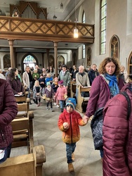 Zu Erntedank lud die Pfarrei und das Kinderkirchenteam zum Gottesdienst ein. In Zusammenarbeit mit dem OGV, der neben den wunderschön gestalteten Erntegaben vor dem Altar einen Erntewagen bereitstellte, zogen die Kinder in die Kirche mit ihren Erntegaben ein und legten sie in den Erntewagen. Die Kinderkirche feierte ihren eigenen Erntedankgottesdienst im vollgefüllten Pfarrzentrum. Gemeinsam bereiteten die Kinder in der Mitte Früchte und Gemüse. Damit die Pflanzen Früchte tragen braucht es Sonne, Regen und gute Erde. Es braucht auch die Arbeit des Menschen. Gott möchte, dass auf unserer Erde alles gut wachsen und gedeihen kann. Er sorgt für uns und schenkt uns seinen Segen.Wir beteten und malten einen Erntekorb, bevor wir in der Pfarrkirche den Segen erhielten.