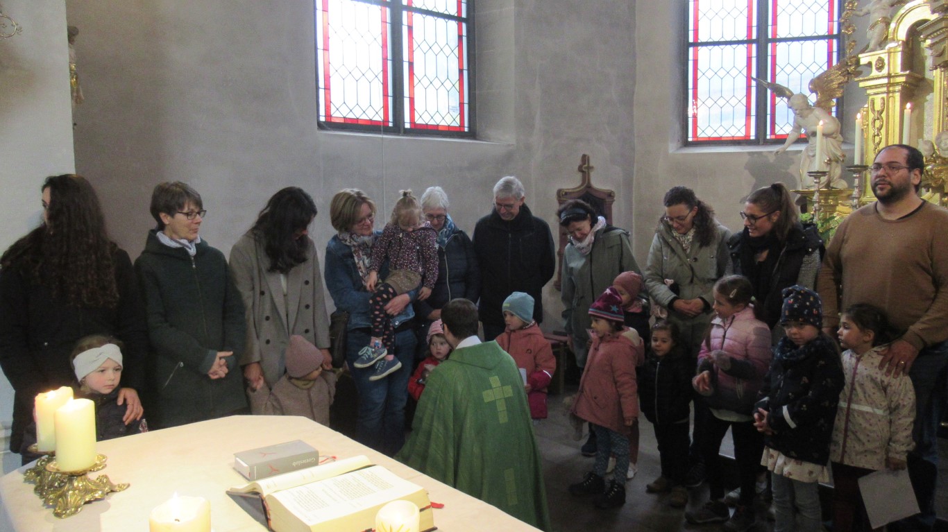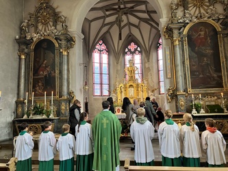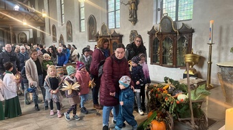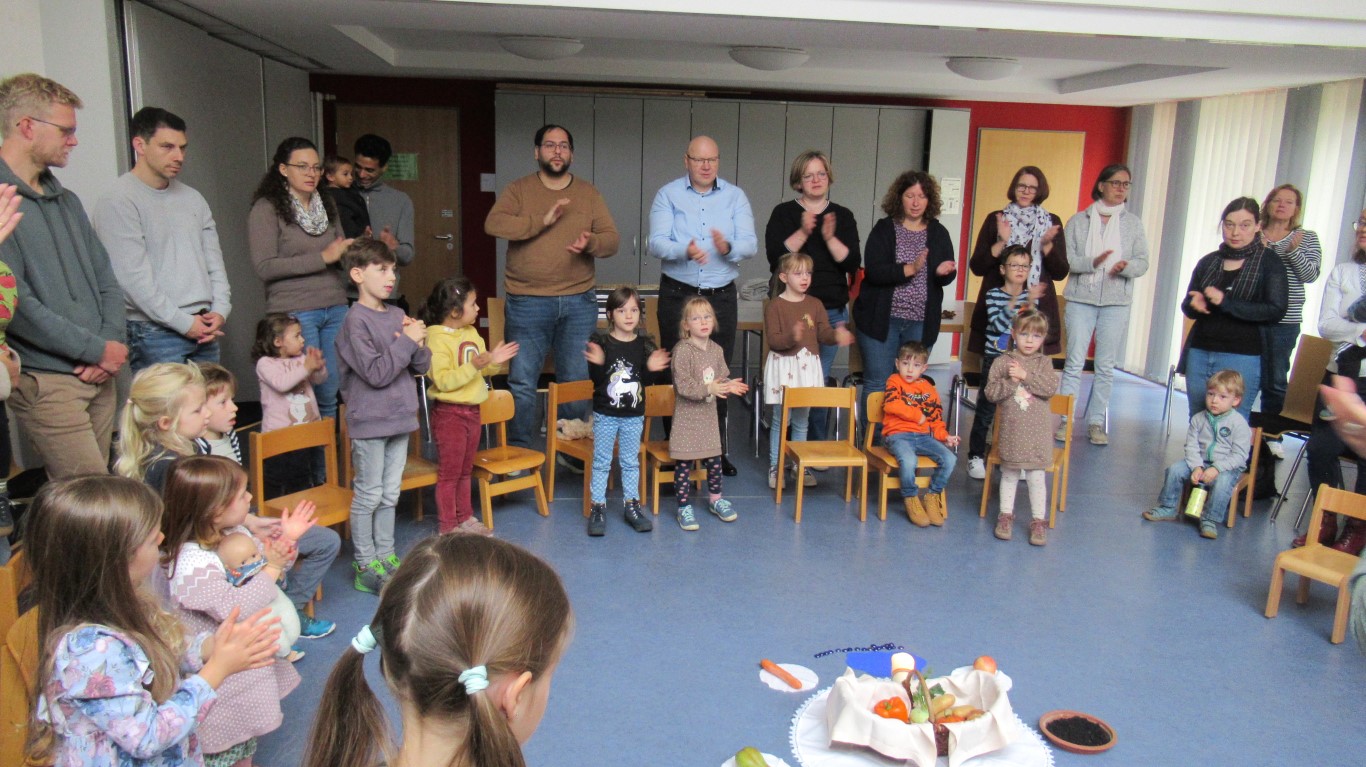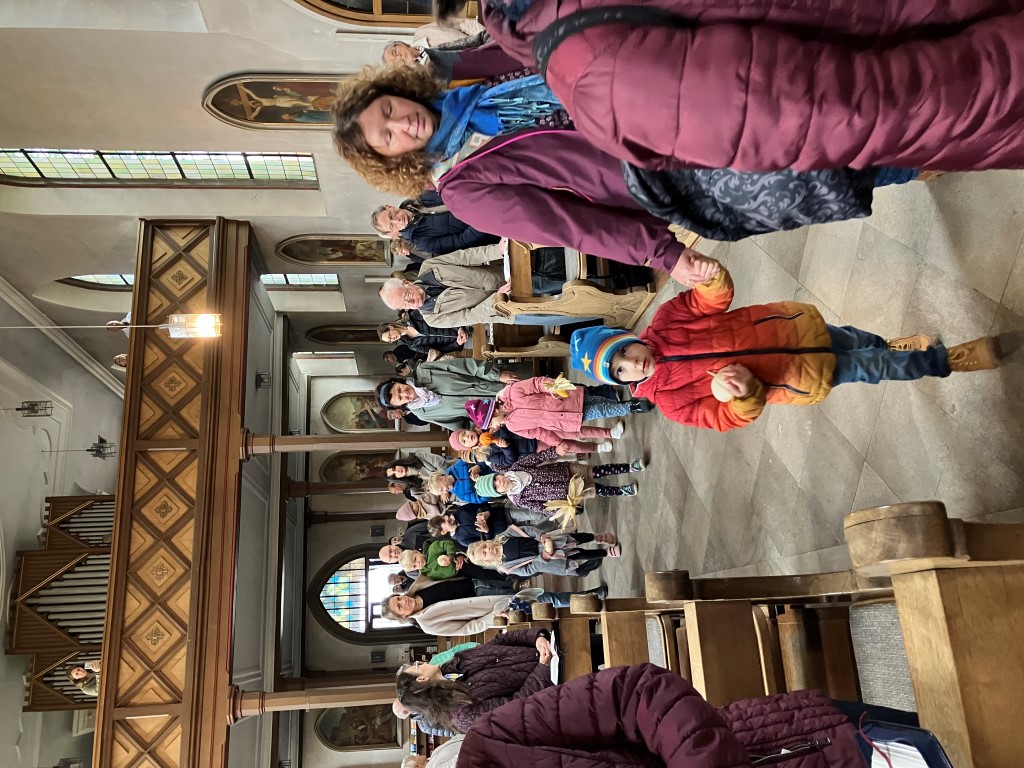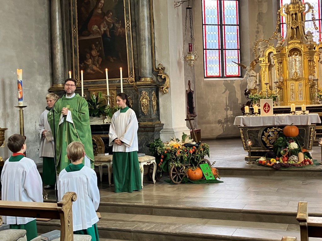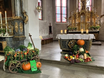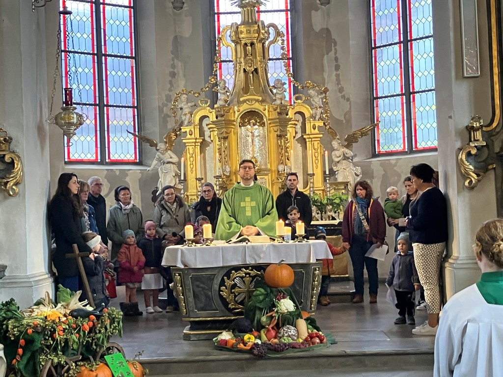 Zu Erntedank lud die Pfarrei und das Kinderkirchenteam zum Gottesdienst ein. In Zusammenarbeit mit dem OGV, der neben den wunderschön gestalteten Erntegaben vor dem Altar einen Erntewagen bereitstellte, zogen die Kinder in die Kirche mit ihren Erntegaben ein und legten sie in den Erntewagen. Die Kinderkirche feierte ihren eigenen Erntedankgottesdienst im vollgefüllten Pfarrzentrum. Gemeinsam bereiteten die Kinder in der Mitte Früchte und Gemüse. Damit die Pflanzen Früchte tragen braucht es Sonne, Regen und gute Erde. Es braucht auch die Arbeit des Menschen. Gott möchte, dass auf unserer Erde alles gut wachsen und gedeihen kann. Er sorgt für uns und schenkt uns seinen Segen.Wir beteten und malten einen Erntekorb, bevor wir in der Pfarrkirche den Segen erhielten.