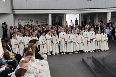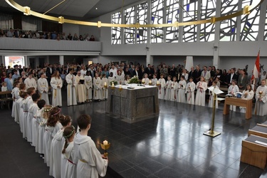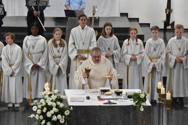 Sie saßen um den Altar und haben gemeinsam Gottesdienst gefeiert. Pater Bernd hat ihnen dabei die Bedeutung der Wandlung erklärt und danach durften alle Kinder an der Eucharistie teilnehmen.