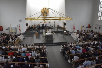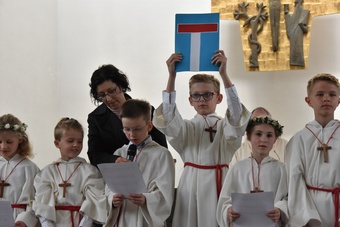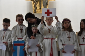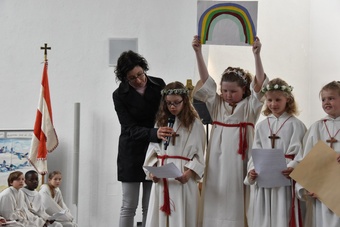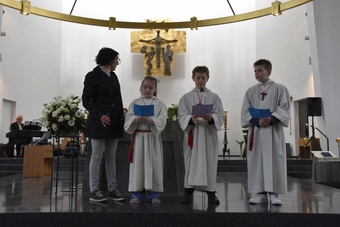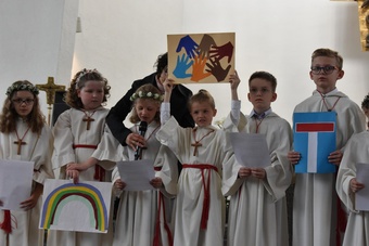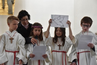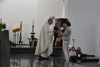 Sie saßen um den Altar und haben gemeinsam Gottesdienst gefeiert. Pater Bernd hat ihnen dabei die Bedeutung der Wandlung erklärt und danach durften alle Kinder an der Eucharistie teilnehmen.