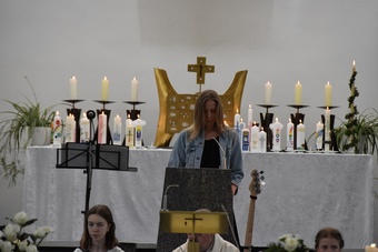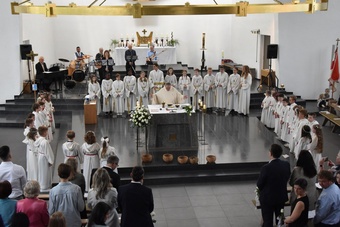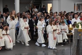 Es war eine schöne Feier. Für die musikalische Umrahmung wurde die Band Sound & So engagiert. Das Schlusslied „Großer Gott wir loben dich“ wurde von dem Onkel eines Kommunionkindes auf der Orgel angestimmt. Die Musiker haben den Gottesdienst mit viel Schwung begleitet und die Familien in guter Stimmung entlassen.