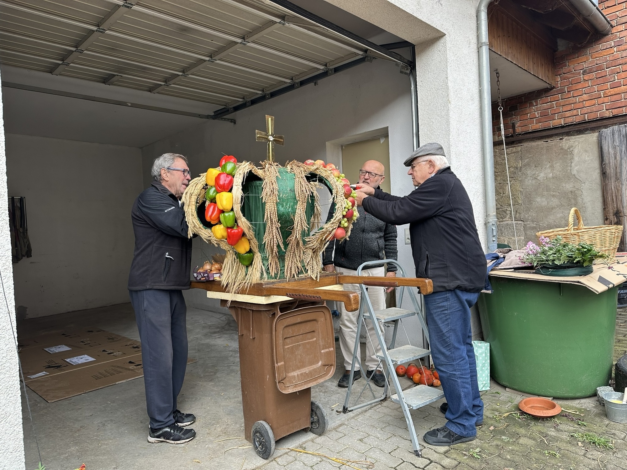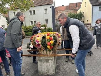 Zu besehen und zu bestaunen gab es bei einem kurzen Festzug und dann in der Kirche beim Gottesdienst die großartige Erntekrone, getragen von Dietrich Kühne, Ralf Pfaff, Stefan Kraft und Bernd Hesselbach, zuverlässige Helfer bei vielen Aktionen des Gerbrunner Obst- und Gartenbauvereins. Tagelang waren auf dem Hof und in der Garage von Bruno Kraft Reinhold Philipp, Hermann Wittstadt, Alfred Engert, Peter Wetzel und andere damit beschäftigt, die Erntekrone zu schmücken, ein imposantes Werk. Auch der übrige Altarraum und der Gang zum Alter waren mit Hilfe von Frau Ringelmann herrlich geschmückt. An den Kirchenbänken waren zudem kleine Getreide-Sträuße angebracht. Zu erwähnen ist sicherlich auch, dass der Bürgermeister und einige GemeinderätInnen, die Freiwillige Feuerwehr und der Spielmanns und Fanfarenzug die Erntekrone zur Kirche begleiteten