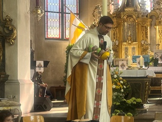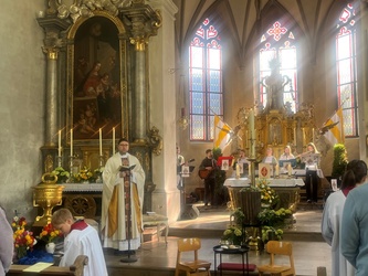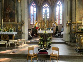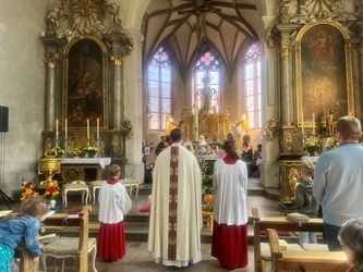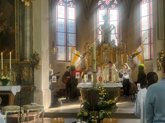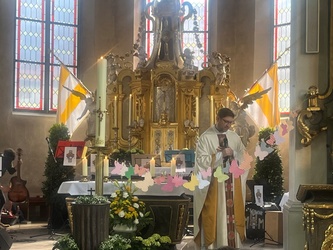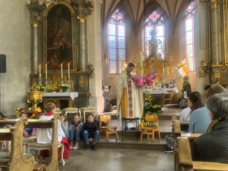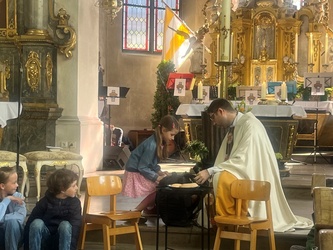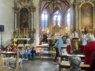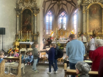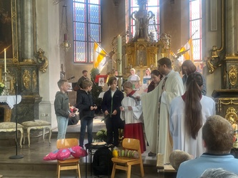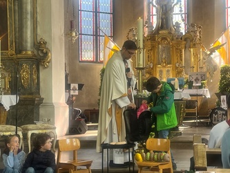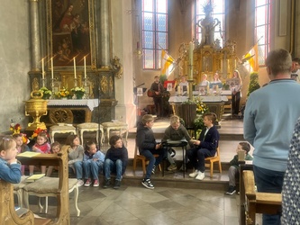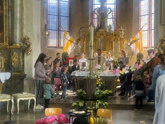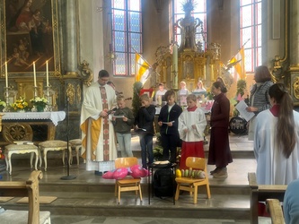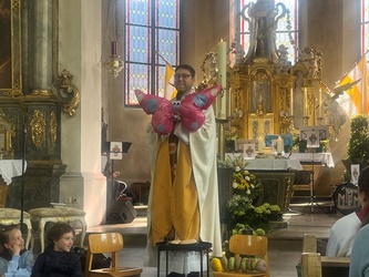 Schwungvoll startete der Familiengottesdienst mit dem Thema der Emmausjünger. Die "MMM-Band" (Martin-Mega-Mini-Band) begleitete den Gottesdienst mit modernen Liedern und alle freuen sich bereits jetzt auf weitere Gottesdienste. Alle Kinder waren nach ganz vorne auf den Treppenstufen vor dem Altar eingeladen Platz zu nehmen, um das Evangelium der Emmausjünger aus nächster Nähe zu hören und sehen. Mehrere Kinder spielten pantomimisch die Geschichte und brachten dazu einen großen Rucksack mit. Geheimnisvoll - was wohl noch im Rucksack verborgen war? Eine große Raupe kam zum Vorschein. Was hat die Raupe mit Ostern zu tun?