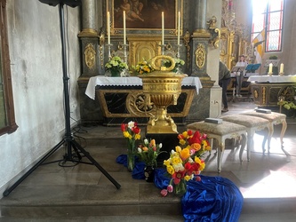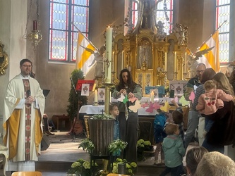 Ein ganzer Schwarm an bunten Schmetterlingen wurde neben der neuen Osterkerze aufgehängt. Auch die Fürbitten gestalteten Kinder und junge Erwachsene. - Ein Gottesdienst für die ganze Familie.-