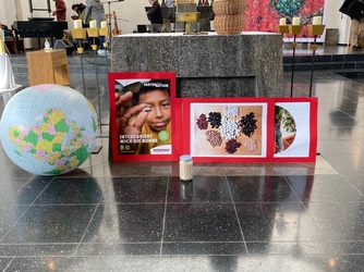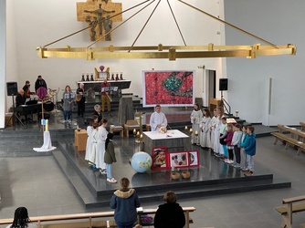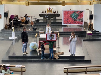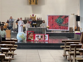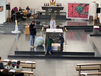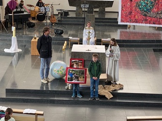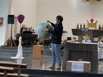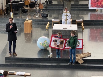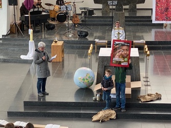 Vor dem Altar lag ein großes Paket mit dem Absender „Kolumbien“, dem diesjährigen Partnerland. Neben zwei Gläsern mit Bohnen kamen beim Auspacken Bilder aus Kolumbien zum Vorschein. In Berichten von Kolumbianern wurde deutlich, worum es beim dortigen Projekt von Misereor geht: Unterstützung von Kleinbauern, die sich zusammenschließen, um den großen Agrarkonzernen die Stirn zu bieten und nachhaltige Landwirtschaft zu betreiben. Die Ziele sind finanzielle Unabhängigkeit, gesunde Ernährung und ein zuversichtlicher Blick in die Zukunft. Weltweit werden 70 % aller Nahrungsmittel von Kleinbauern und - bäuerinnen angebaut, ihre Arbeit ist damit alles entscheidend für die Ernährung der Menschen. Doch der Klimawandel, die Ausbreitung von Schädlingen und der illegale Anbau von Koka sind Herausforderungen, die sich nur gemeinsam bewältigen lassen.