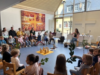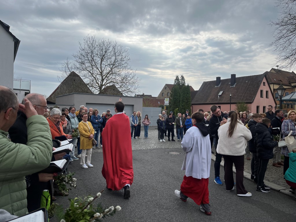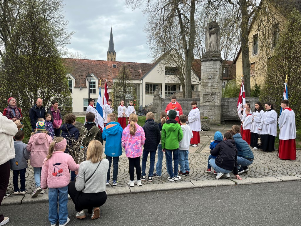 Viele Kinder und Kommunionkinder kamen ganz nach vorn, um vom Einzug Jesu in Jerusalm zu hören. Anschließend zog die Gemeinde begleitet von der Musikkapelle zur Kirche, um dort den Gottesdienst zu feiern. Zeitgleich feierten auch die Kleinsten ihren eigenen Gottesdienst im Pfarrzentrum. Im Anschluss bot die KAB wieder Osterkerzen an, die im Vorfeld von fleißigen Bastlern der Pfarrei gestaltet wurden. Der Erlös geht in diesem Jahr an "Kinder Würzburger Intensivstationen" (Kiwi). Herzlichen Dank an die Musikapelle, die tradionell die Palmweihe musikalisch begleitet.
