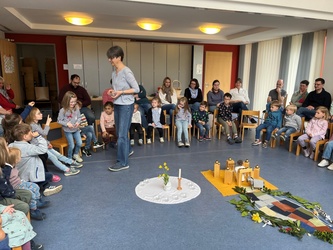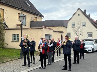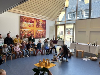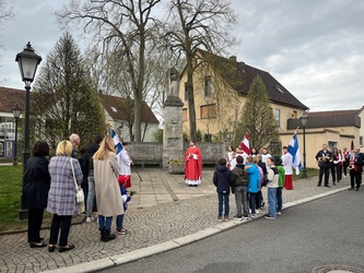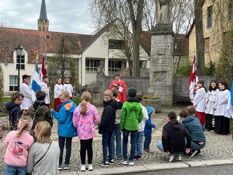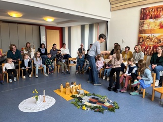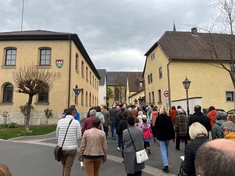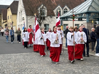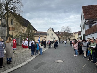 Viele Kinder und Kommunionkinder kamen ganz nach vorn, um vom Einzug Jesu in Jerusalm zu hören. Anschließend zog die Gemeinde begleitet von der Musikkapelle zur Kirche, um dort den Gottesdienst zu feiern. Zeitgleich feierten auch die Kleinsten ihren eigenen Gottesdienst im Pfarrzentrum. Im Anschluss bot die KAB wieder Osterkerzen an, die im Vorfeld von fleißigen Bastlern der Pfarrei gestaltet wurden. Der Erlös geht in diesem Jahr an "Kinder Würzburger Intensivstationen" (Kiwi). Herzlichen Dank an die Musikapelle, die tradionell die Palmweihe musikalisch begleitet.