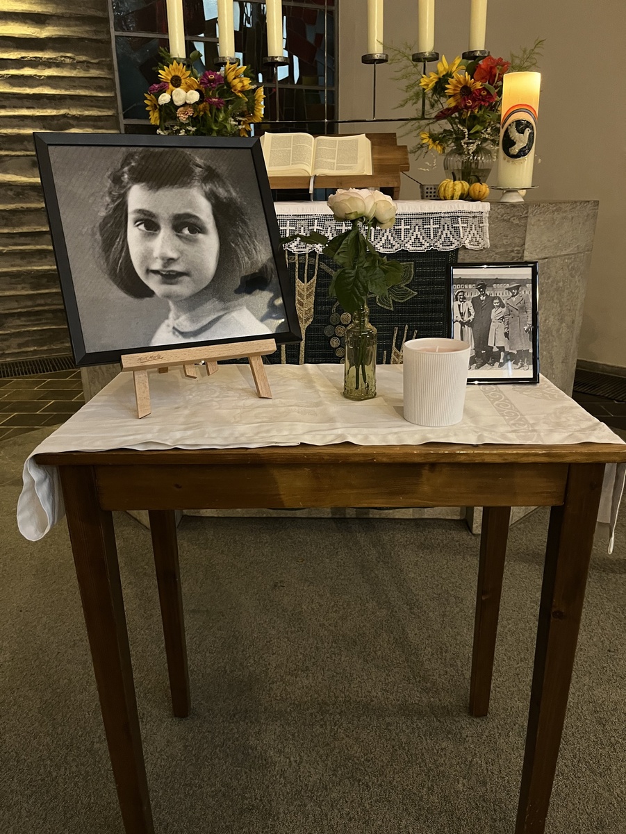 Immer wieder werden aktuelle Themen zum Thema Frieden aufgegriffen. Bibeltexte, meditative Texte, Fürbitten, Gebete und Lieder geben Zuversicht und Kraft für den Alltag. Im September wurde das Friedensgebet zum Thema Anne Frank vom Arbeitskreis Liturgie vorbereitet.