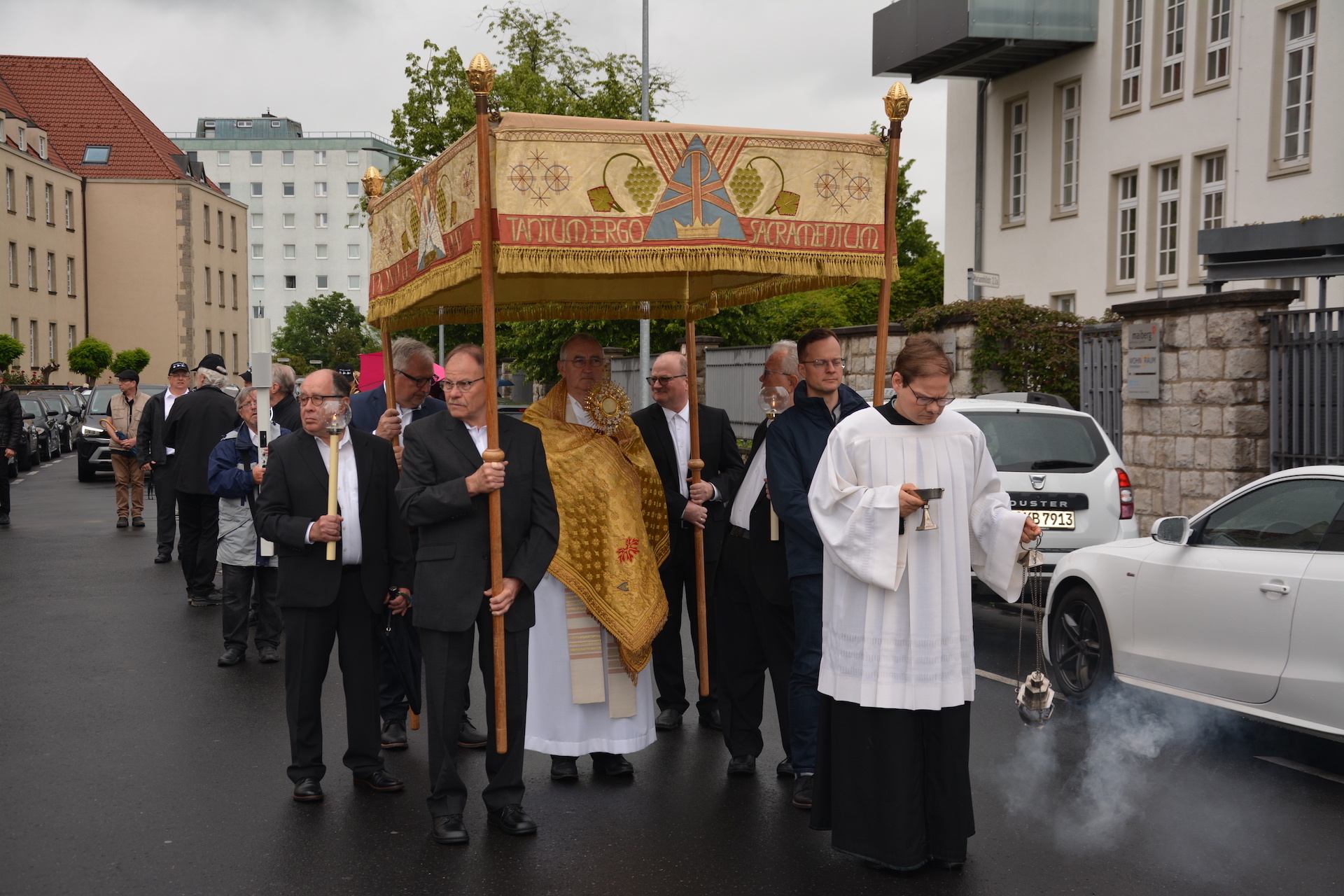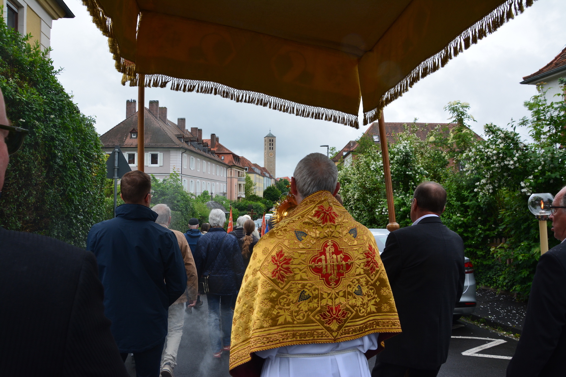 Also konnte die Fronleichnamsprozession losziehen und der Weg führte dieses Jahr wieder von Mariannhill in die Pfarrkirche Unsere Liebe Frau. Begleitet vom Bläserensemble „Heilichs Blechle“ zogen die Gläubigen über die Wittelsbacher Straße, den Gerbrunner Weg und die Frauenlandstraße zur Kirche. Der Blumenteppich war dieses Jahr in der Kirche, wo dann der feierliche Abschlusssegen erteilt und das Te Deum angestimmt wurde.
