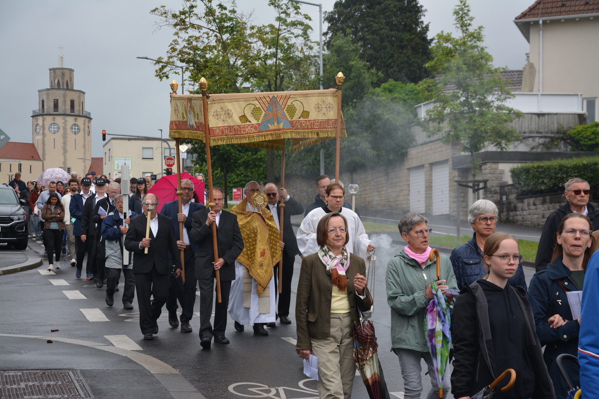 Das Wetter war sehr unsicher, nach starkem Regen in der Nacht regnete es auch noch vor dem Gottesdienst. Deshalb war unklar, ob die Prozession überhaupt stattfinden kann, oder ob wir in der Kirche bleiben müssen. Während der Feier ließ der Regen nach und das Regenradar zeigte eine trockene Phase an.