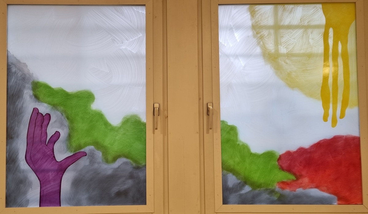 Der graue Hintergrund, der die beiden Fenstern im unteren Teil durchzieht, steht dann für ein Leben, das routiniert und öd geworden ist. Die Welt kann zur Wüste werden, wenn wir uns in alltäglichen Sorgen und Arbeiten verlieren. Wo kommt Sinn her? Wo entdecke ich eine Perspektive nach vorne? Wonach kann ich mich ausstrecken? Der Beter reißt die Hände zum Sonnenlicht empor. Wir kennen nur noch vom Priester die ausgebreiteten Hände als Gebetshaltung. Für die frühen Christen war die sog. „Oranten-Haltung“ die gängige Form: flehentliches Bitten und empfangende Offenheit verbindet sich in ihr. Die verzerrt wirkenden Hände sind mehr als der Ausdruck von Bedürftigkeit. In ihnen bricht sich die Sehnsucht nach wahrem Leben Bahn: „Zeig mir den Weg, den ich gehen soll; / denn ich erhebe meine Seele zu dir."