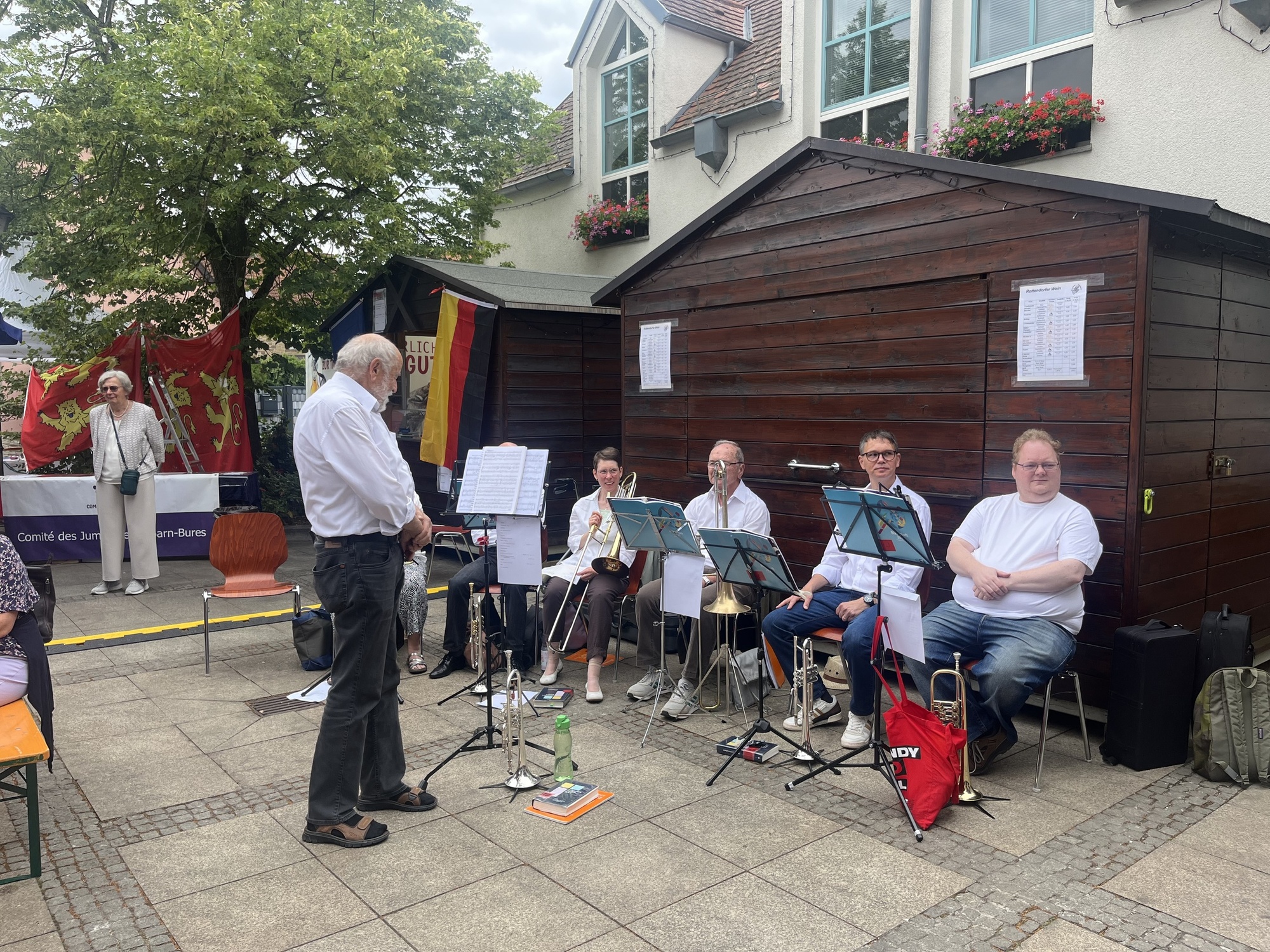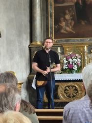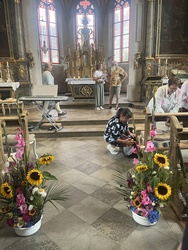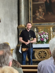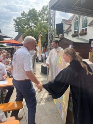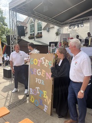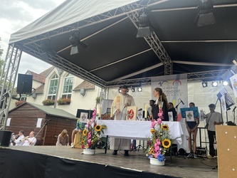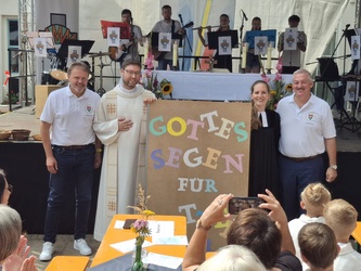 „Die Zeit ist jetzt. Wir laufen los. Gott geht mit uns. Das Leben ruft.“ Die Menschen beider Gemeinden feierten im Hier und Jetzt, was Gott uns heute schenkt. Verschiedene Aktionen während des Gottesdienstes bereiteten gute Laune. Das Dorffest und das 1000jährige Jubiläum der Gemeinde waren einer von vielen Gipfelmomenten, die manch einer vielleicht schon erlebt hat, wenn er einen 1000er bestiegen hat, wie Pfarrvikar Manuel Thomas in seiner Ansprache beschrieb. Wir freuen uns über Erinnerungen, sie gehören zu uns und unserem Ort, wie der Blick in die Zukunft. Werte, wie Verantwortungsbewusstsein, Aufmerksamkeit, Achtsamkeit, Fürsorge tragen unsere Gemeinde und so beteten wir für eine lebenswerte Zukunft und weitere glückliche und friedvolle Jahre. Eine riesengroße Geburtstagskarte für die Bürgermeister, bestückt mit vielen Wünschen, Gedanken der Besucher wurde als Überraschung überreicht.