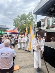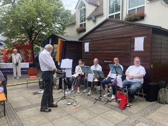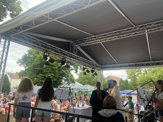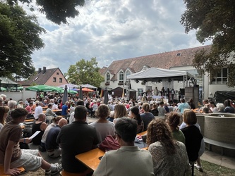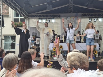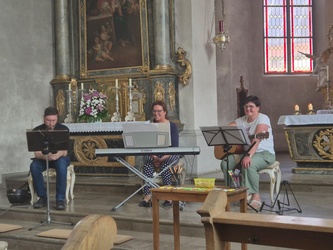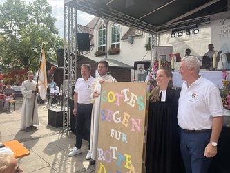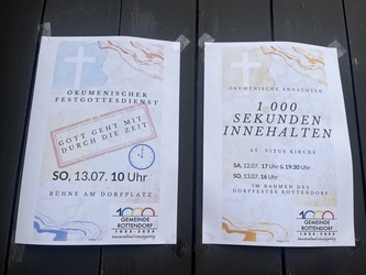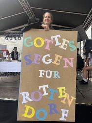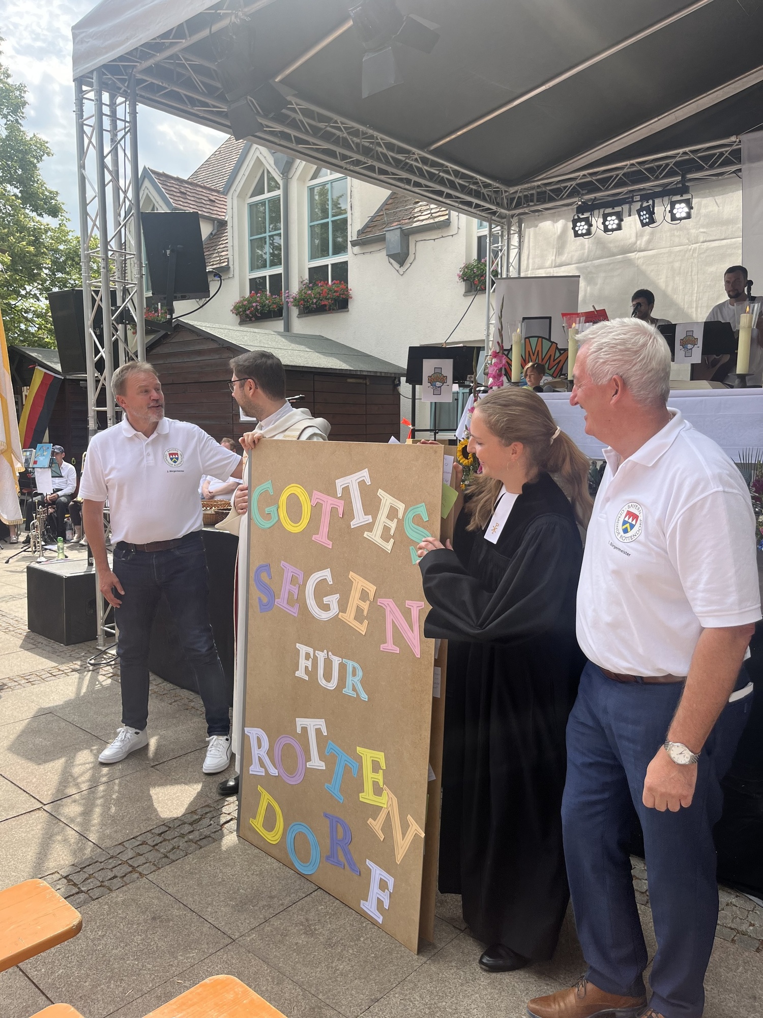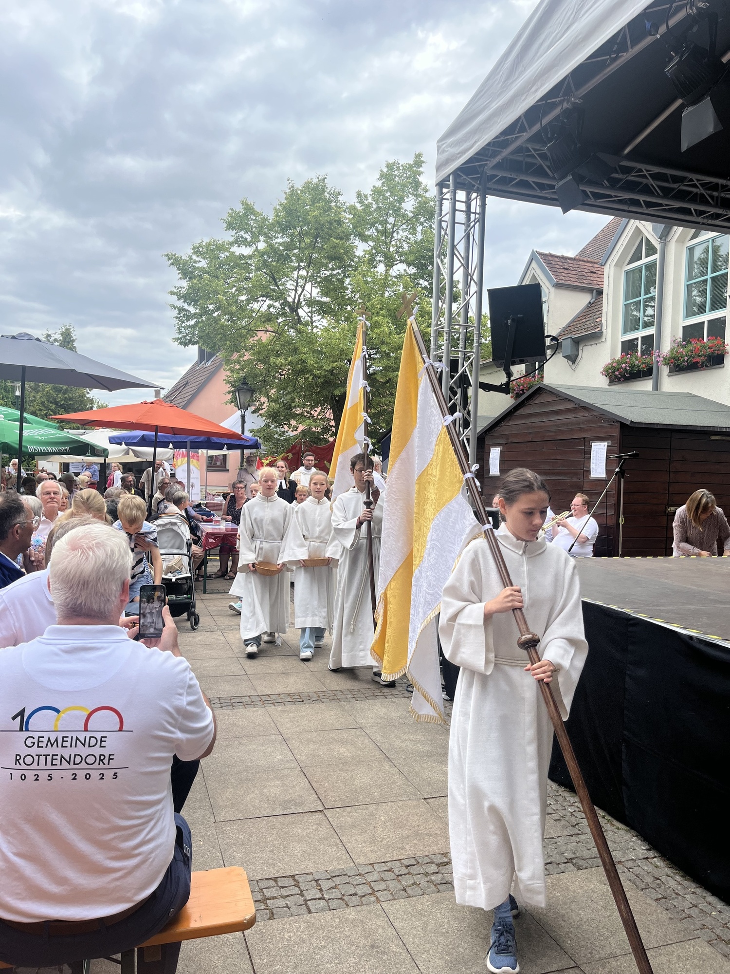 Am Wochenende feierte Rottendorf seine 1000 Jahre am Dorffest. Nicht nur kulinarisch und musikalisch: In einem ökumenischen Festgottesdienst und der Möglichkeit zu geistlichen Impulsen in der Pfarrkirche St. Vitus geht und ging auch Gott mit uns durch die Zeit, so auch der Titel des Festgottesdienstes. Die MMM-Band von St. Vitus und der Posaunenchor der evangelischen Gemeinde führten musikalisch gemeinsam mit Pfarrerin Henrike Acksteiner und Pfarrvikar Manuel Thomas durch den Gottesdienst. „Zeitgemäße“ Musik lud zum Mitsingen und bewegen ein: