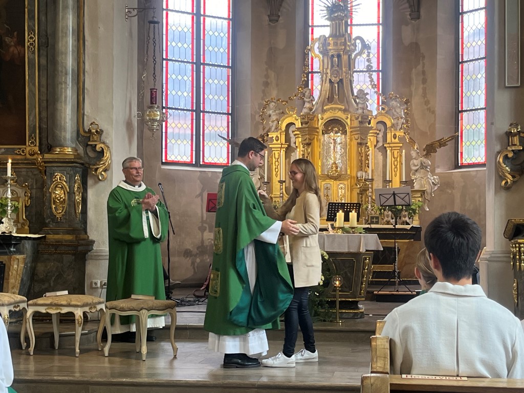 Am Ende des Gottesdienstes begrüßte Michael Seufert von der Kirchenverwaltung und Christian Münch vom Pfarrgemeindeteam Manuel Thomas. Zur Begrüßung gab es Brot und Salz, symbolisch für eine Stärkung und Freundschaft, als Würze des Lebens. Mit offenen Herzen und Händen soll er sich als Teil der Gemeinde fühlen.