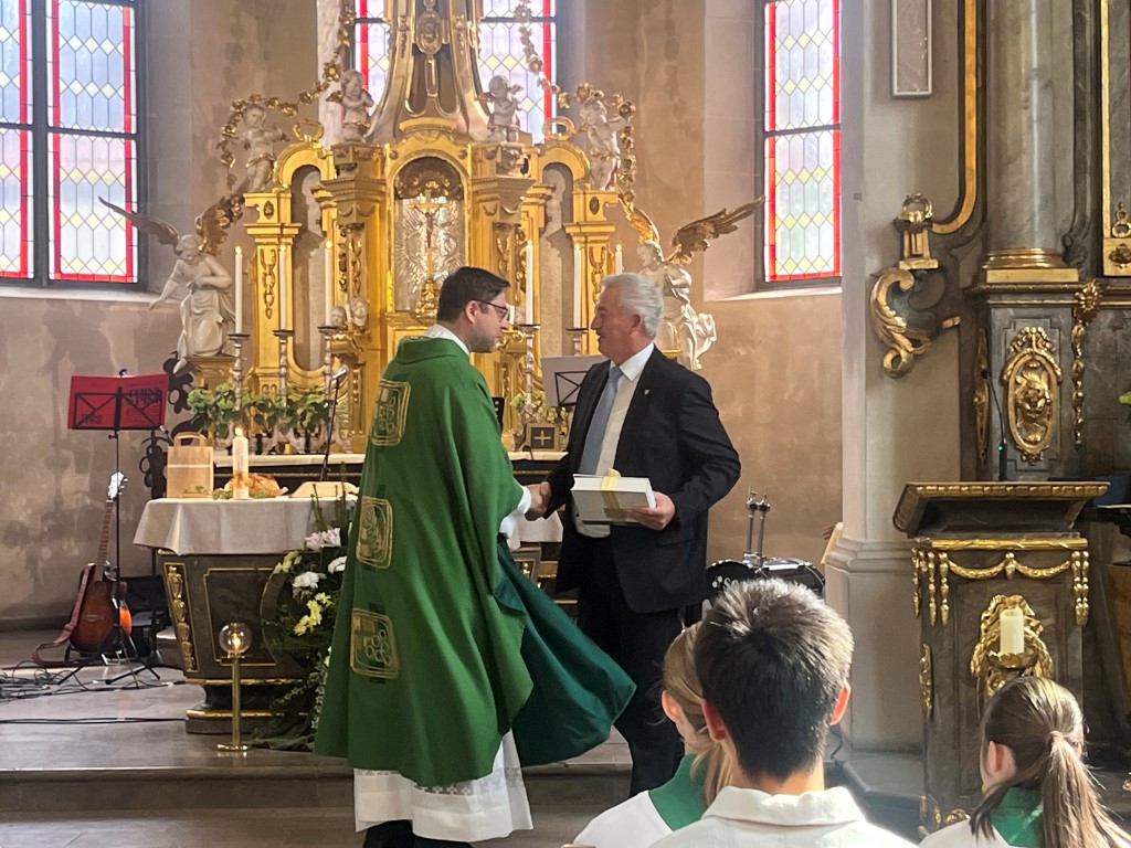 Roland Schmitt 1. Bürgermeister von Rottendorf, brachte die Grußworte der politischen Gemeinde und freute sich auf ein vertrauensvolles Miteinander und ein offenes Ohr. Wir sind eine Gemeinde mit großem Gemeinschaftssinn. Durch die Dorfchronik kann Herrn Thomas einiges über Rottendorf erfahren. Einen guten Tropfen aus den Rottendorfer Lagen brachte er ebenfalls mit.
