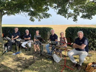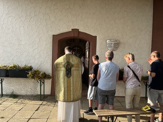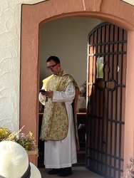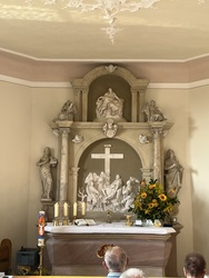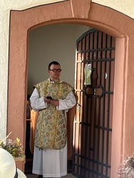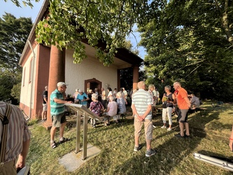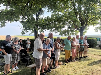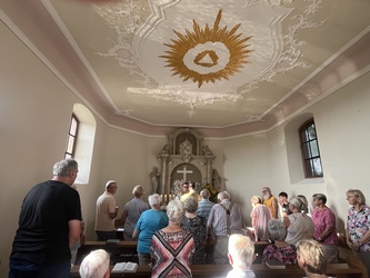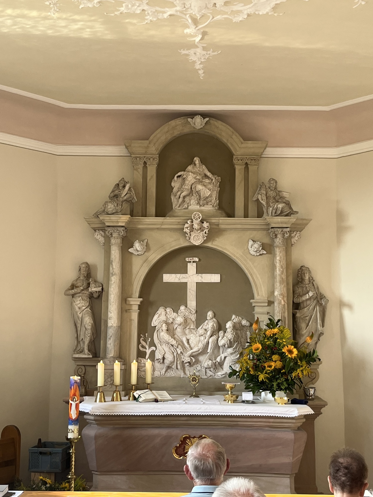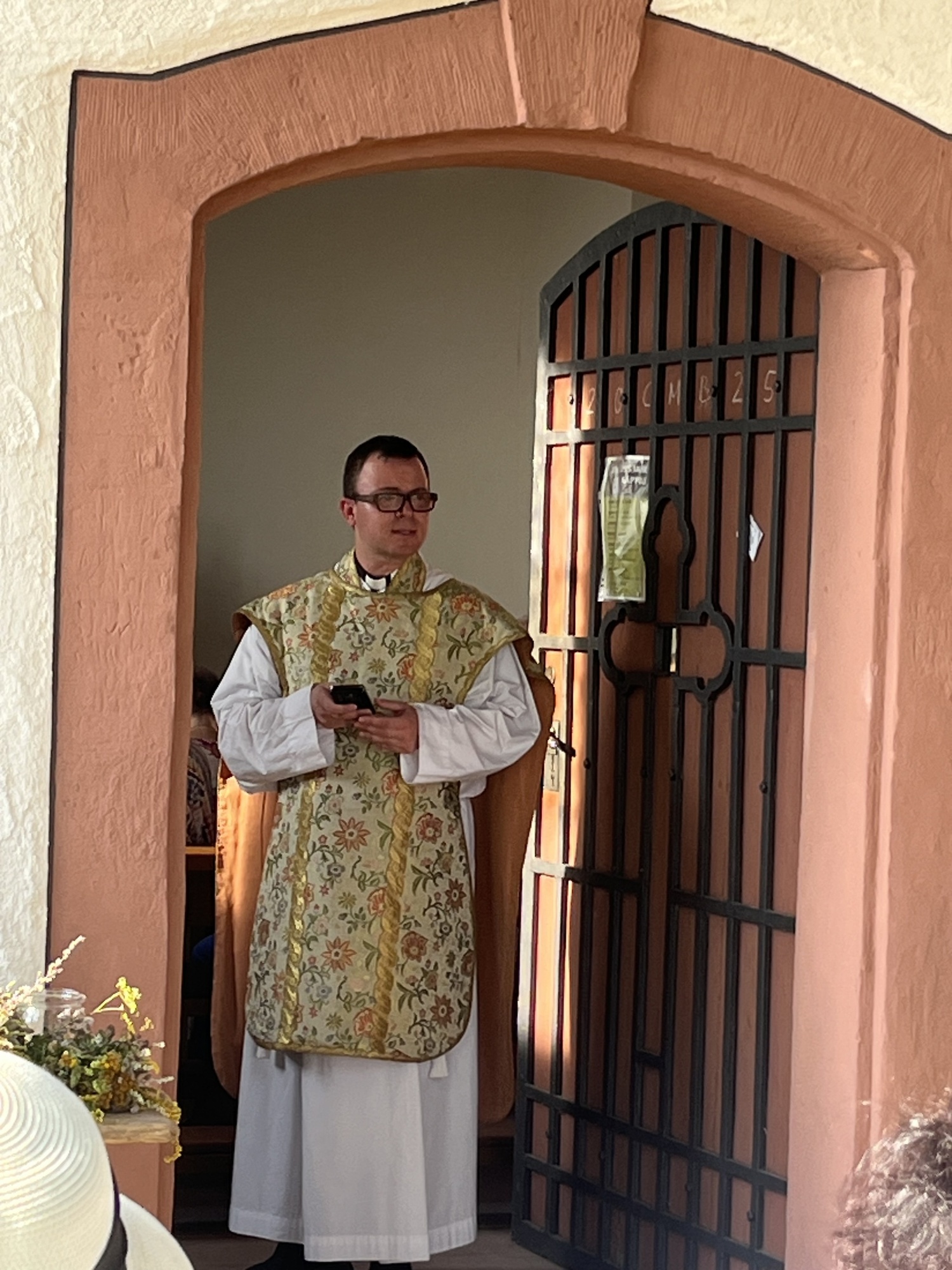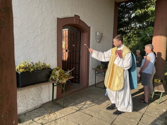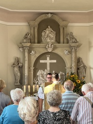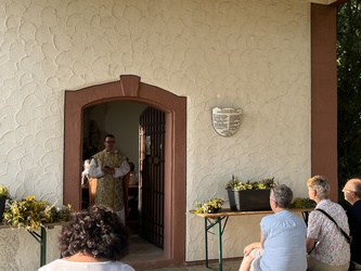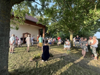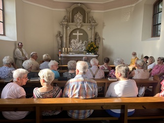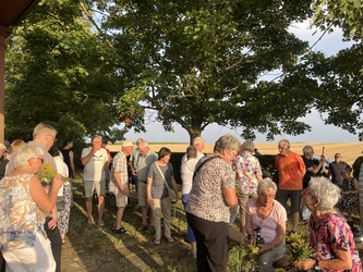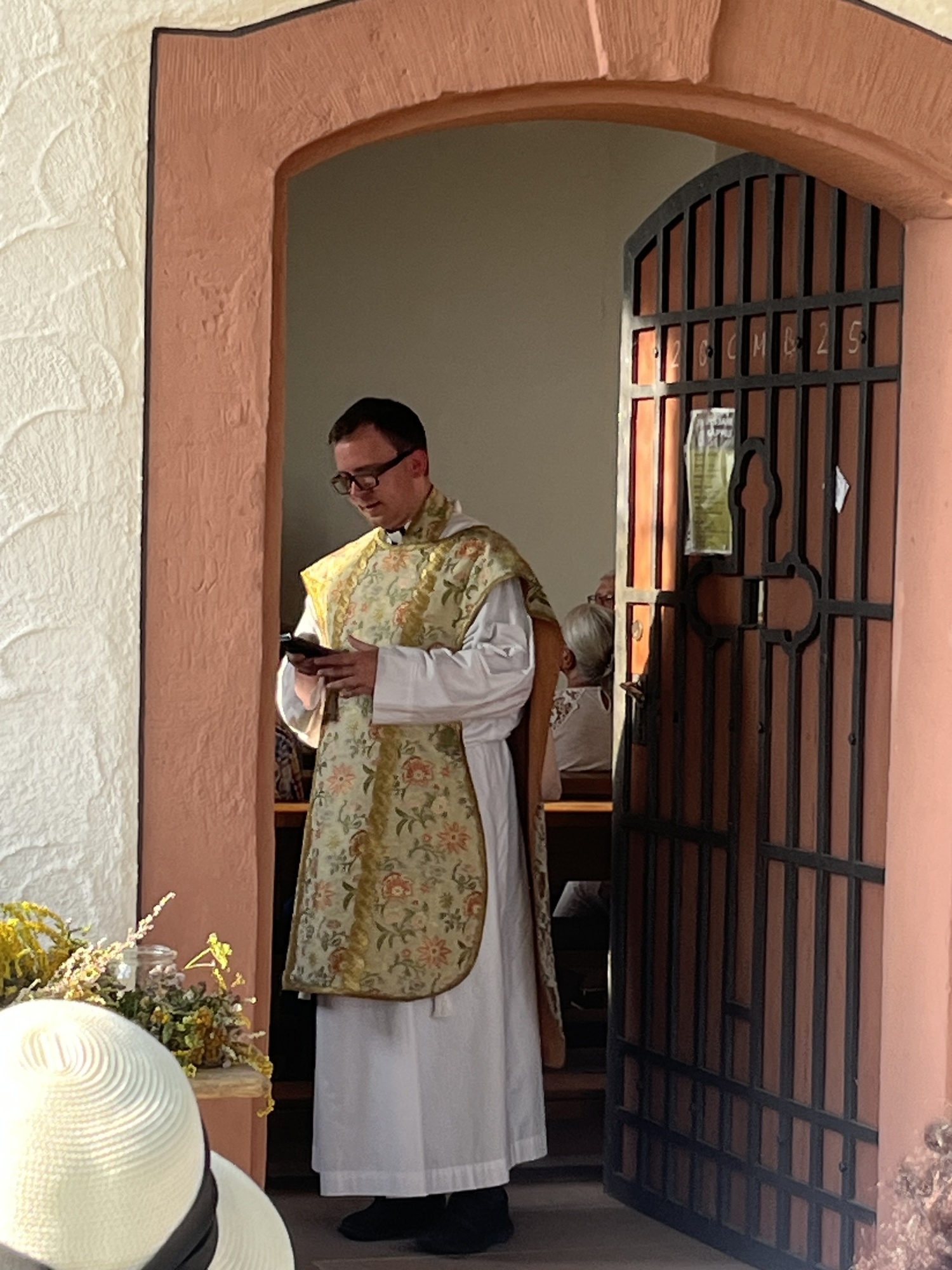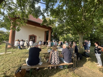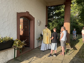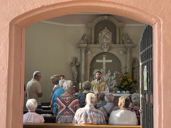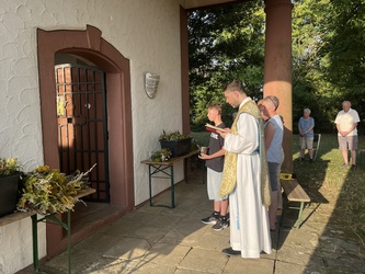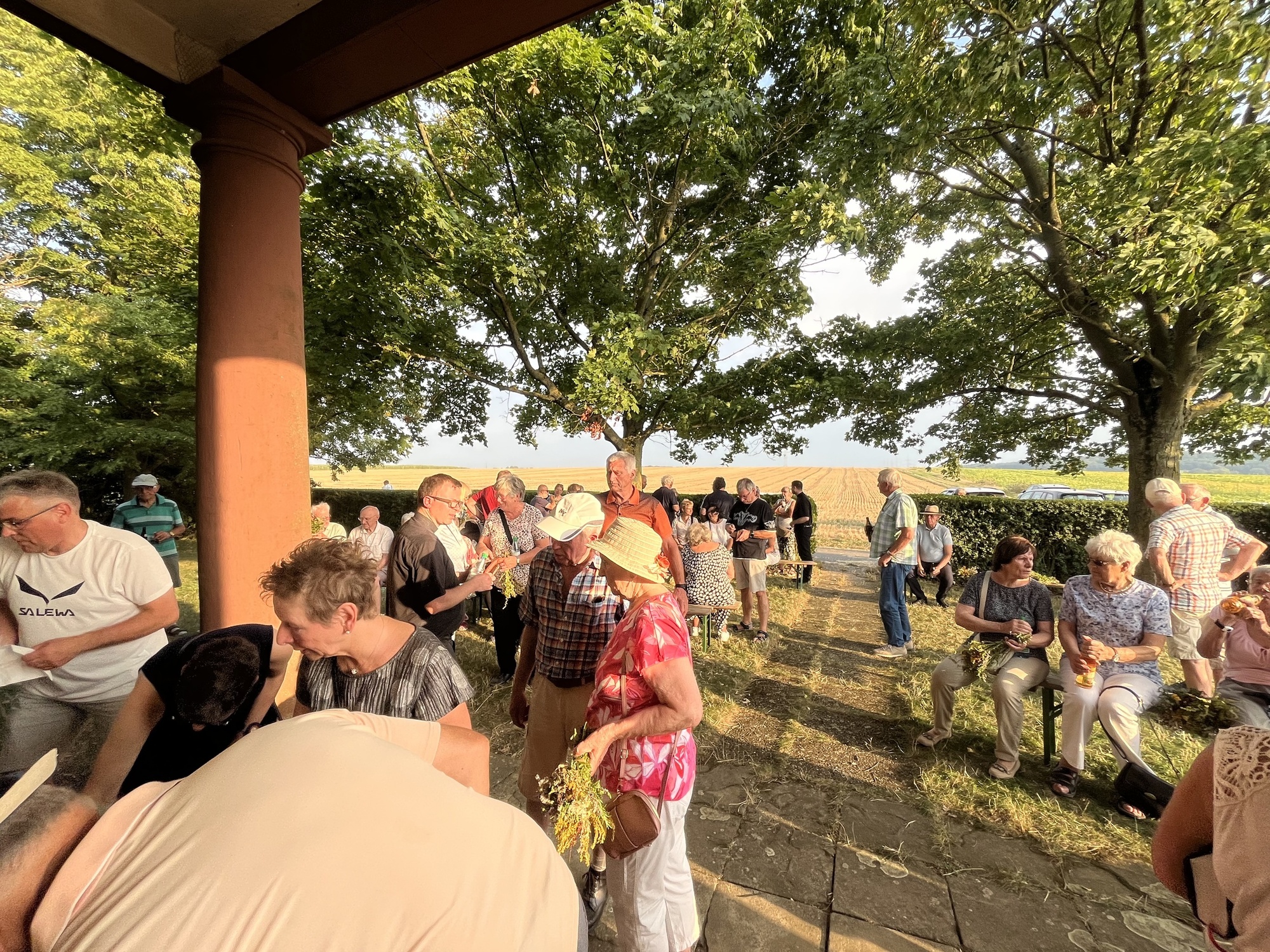 Am sonnigen und sehr heißen Feiertag fanden sich im vollgefüllten und auf der Grünfläche vor dem Käppele ca. 90 Gottesdienstbesucher gegen Abend ein, um dort das Fest Maria Himmelfahrt zu feiern. Es gibt doch keinen passenderen Ort, denn die Kapelle ist der schmerzhaften Mutter Gottes geweiht und steht mitten in den Fluren auf einer Erhöhung von Rottendorf.