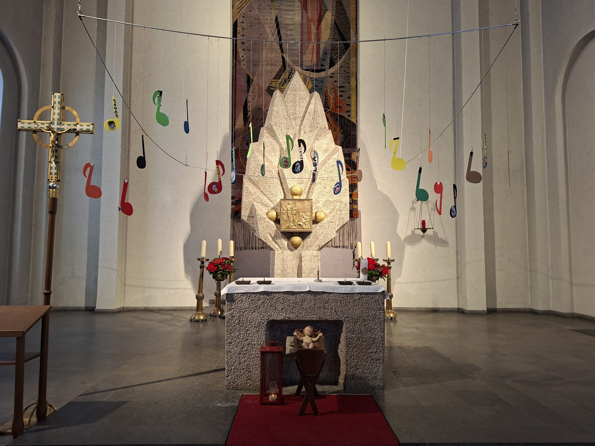 Über dem Altar waren bereits die Noten befestigt, mit denen sich die Kommunionkinder in diesem Gottesdienst vorstellten und das Thema der diesjährigen Erstkommunion bekannt machten: „Du bist ein Ton in Gottes Melodie“.