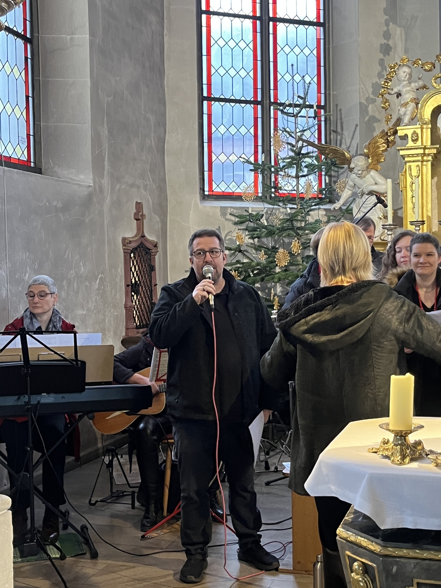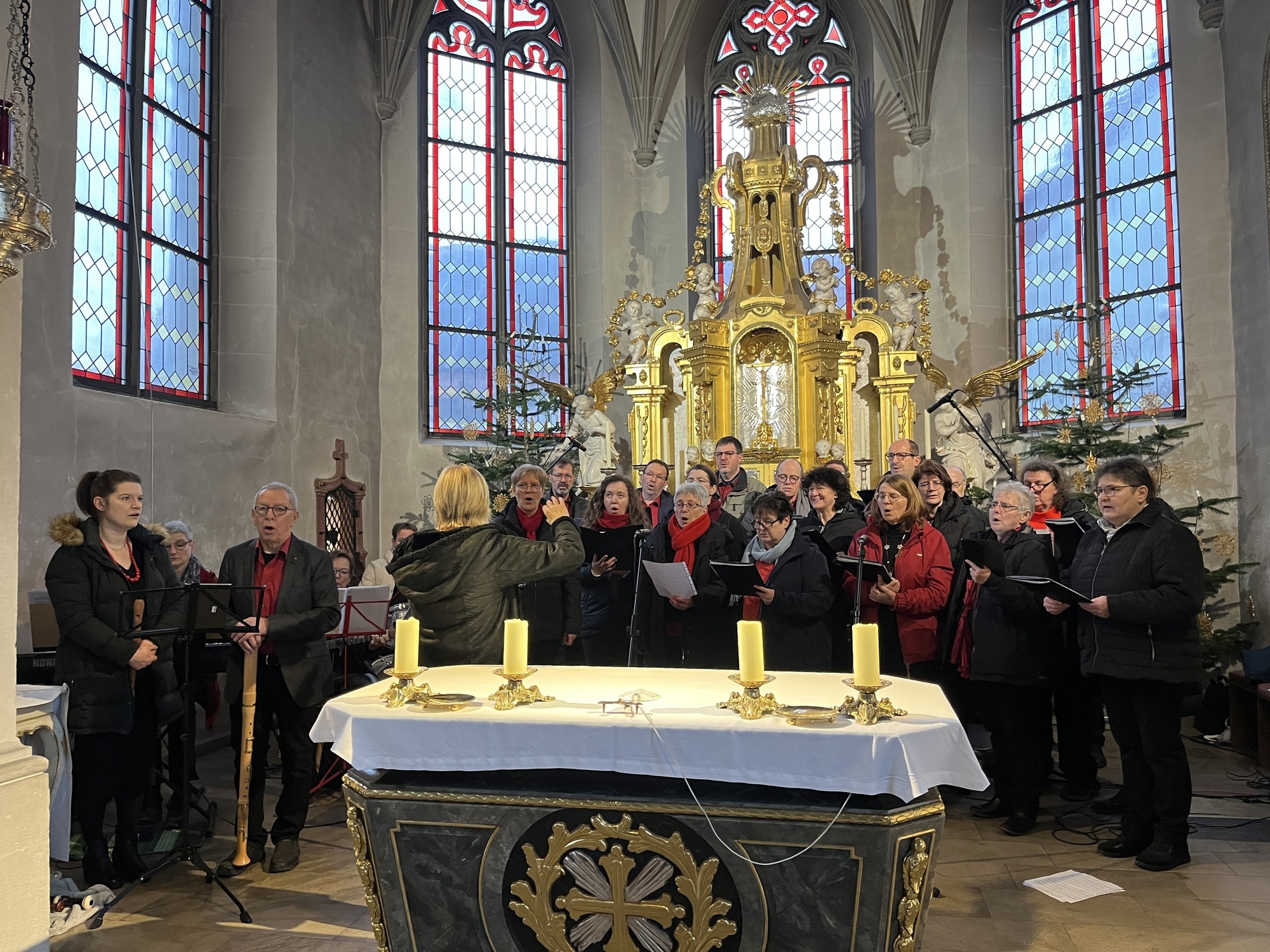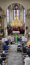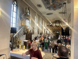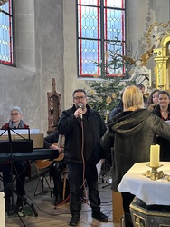 Geschichten aus dem Alten Testament, wie die Befreiung des Volkes Israel sind in den Gospels ebenfalls beispielhaft. Mit "Go down Moses", eröffnete der Chor den Gottesdienst. Begleitet wurde der Chor von Bernd Hesselbach am Schlagzeug, Gertrud Türk an der Gitarre, Ilona Müßig am Keyborad. Franz Schmitt und Katharina Scheller begleiteten mit der Flöte. Herzlichen Dank gilt der Chorleiterin Roswitha Schmitt für ihr Engagement.