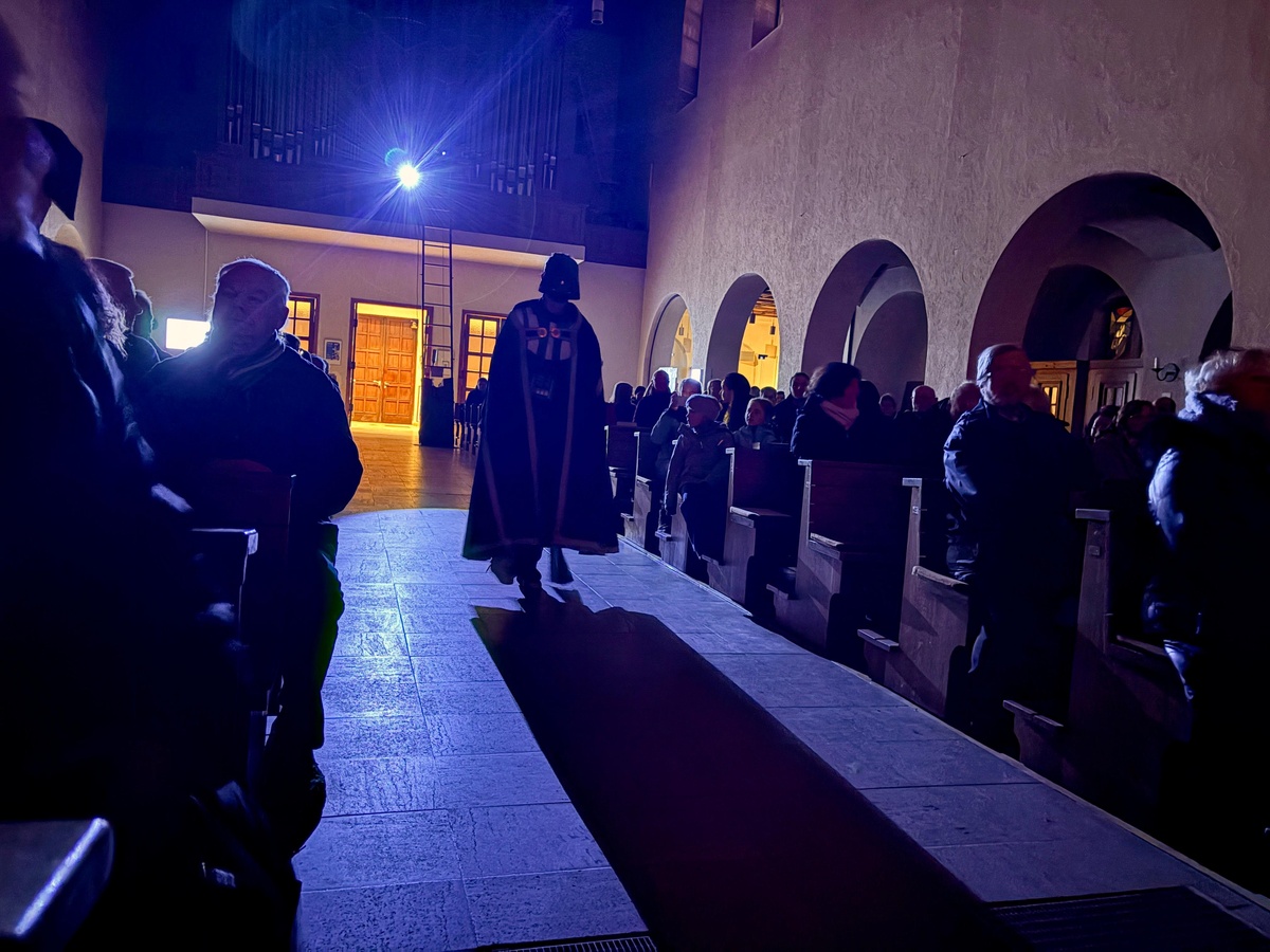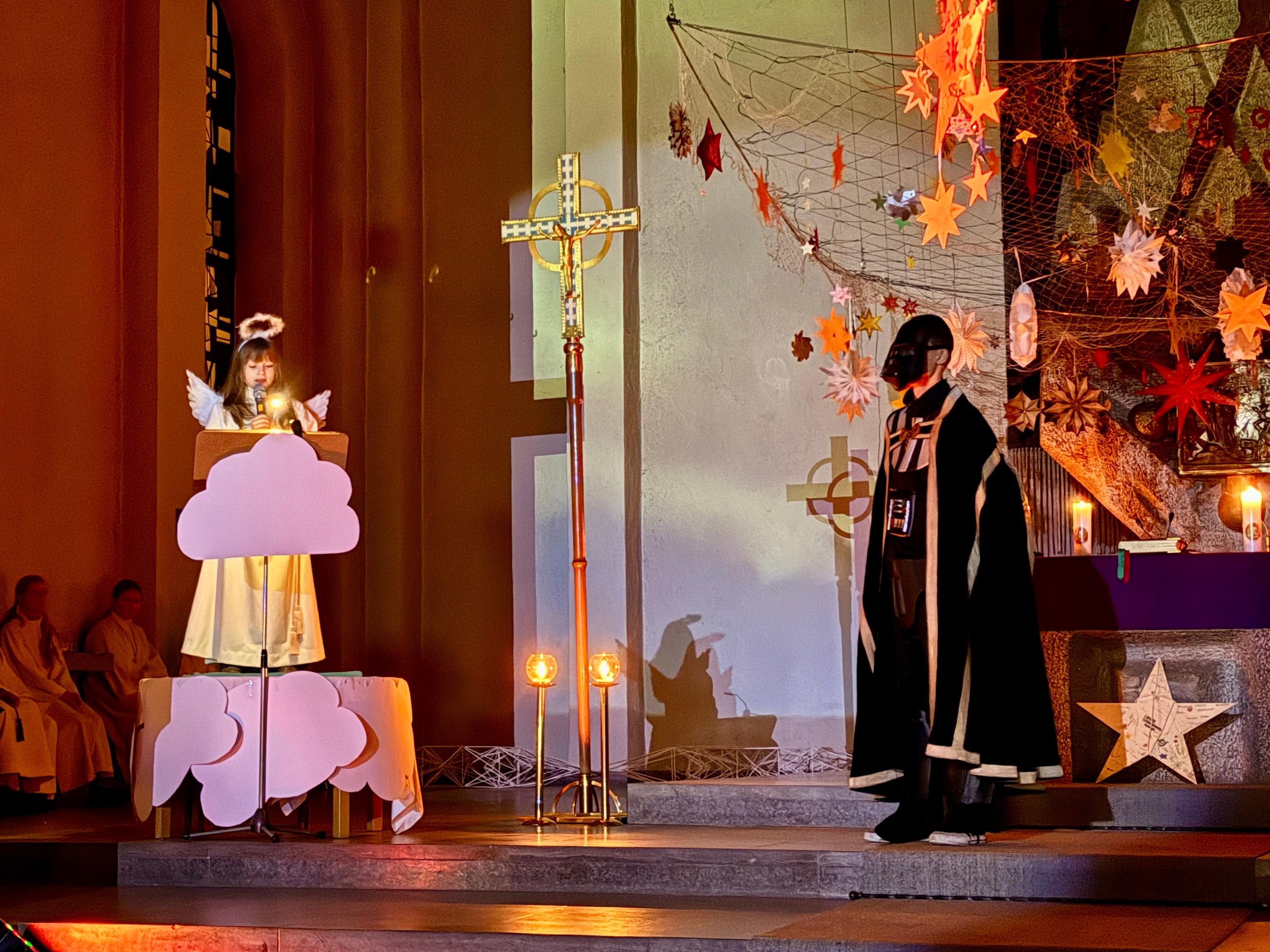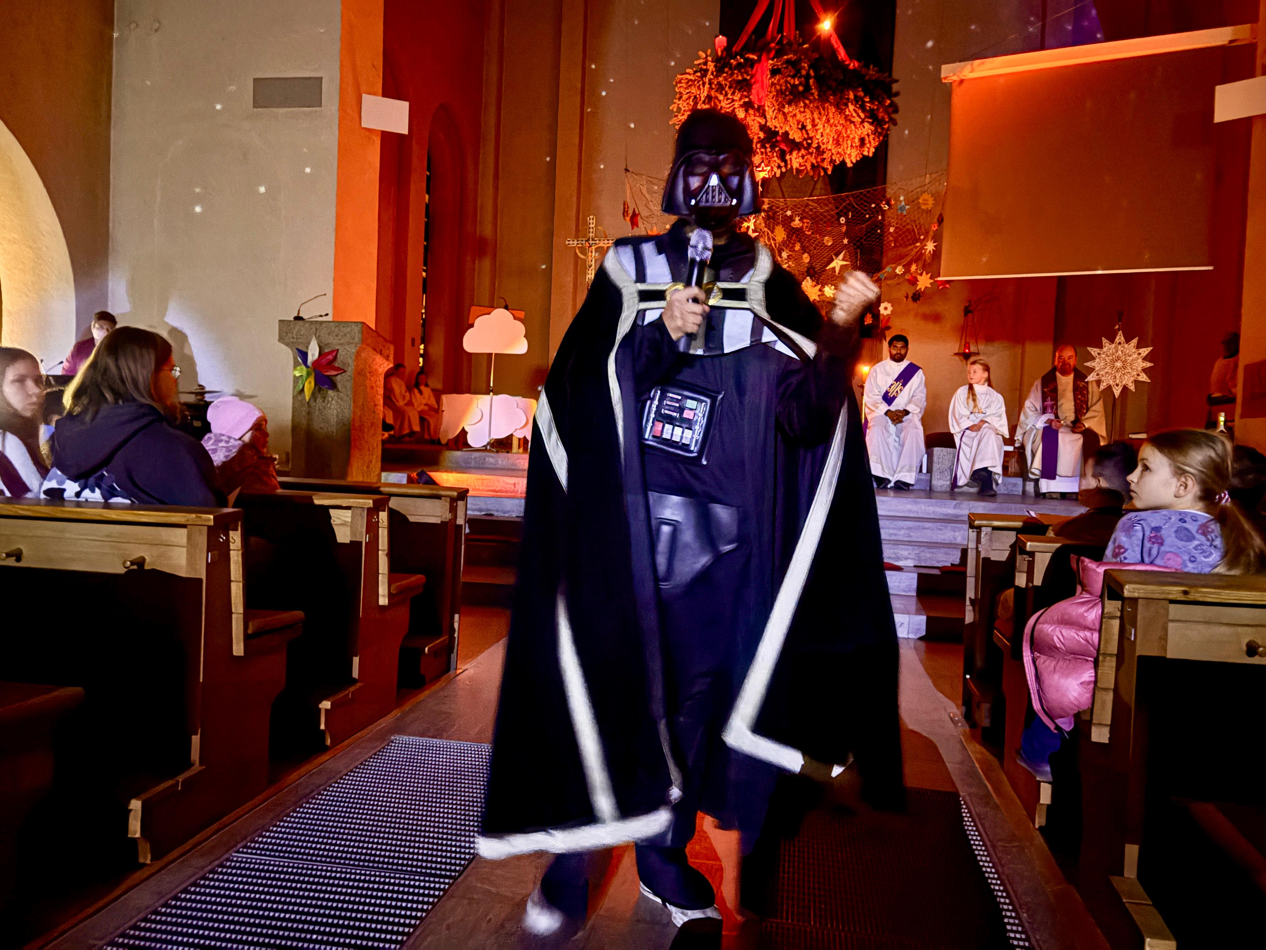 Zwischen Dunkel und Licht schwankt das Leben. Eindrucksvoll eröffneten Darth Vader (Paul Eberlein) und das Christkind (Clara Goldschmitt) mit einem Streitgespräch den Jugendgottesdienst zum 2. Advent in der Pfarrkirche ULF. Traditionell gehört der Samstag der ersten Adventswoche den Jugendgruppen der Pfarrei. Bereits ab Mittag wurden Christbäume verkauft. Am Ende blieb zur Freude der Jugendkassenwarte keiner mehr übrig. Am späten Nachmittag bildete der von den Gruppenleiterinnen und Gruppenleitern vorbereitetet Jugendgottesdienst den Höhepunkt. Zunächst eröffnete die Kinder der KiTa die Feier. Dann sahen sich die Jugendlichen in die Auseinandersetzung zwischen Gut / Licht und Böse / Dunkel, vertreten durch das Christkind und den dunklen Akteur aus Starwars, hineingezogen. In ihrer Einleitung wies Maximiliane darauf hin, dass die Menschen meist weder ganz böse, noch ganz gut sind. Es gibt helle Augenblicke, in denen wir im Leben das Richtige machen und glücklich sein können.
