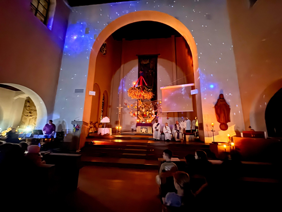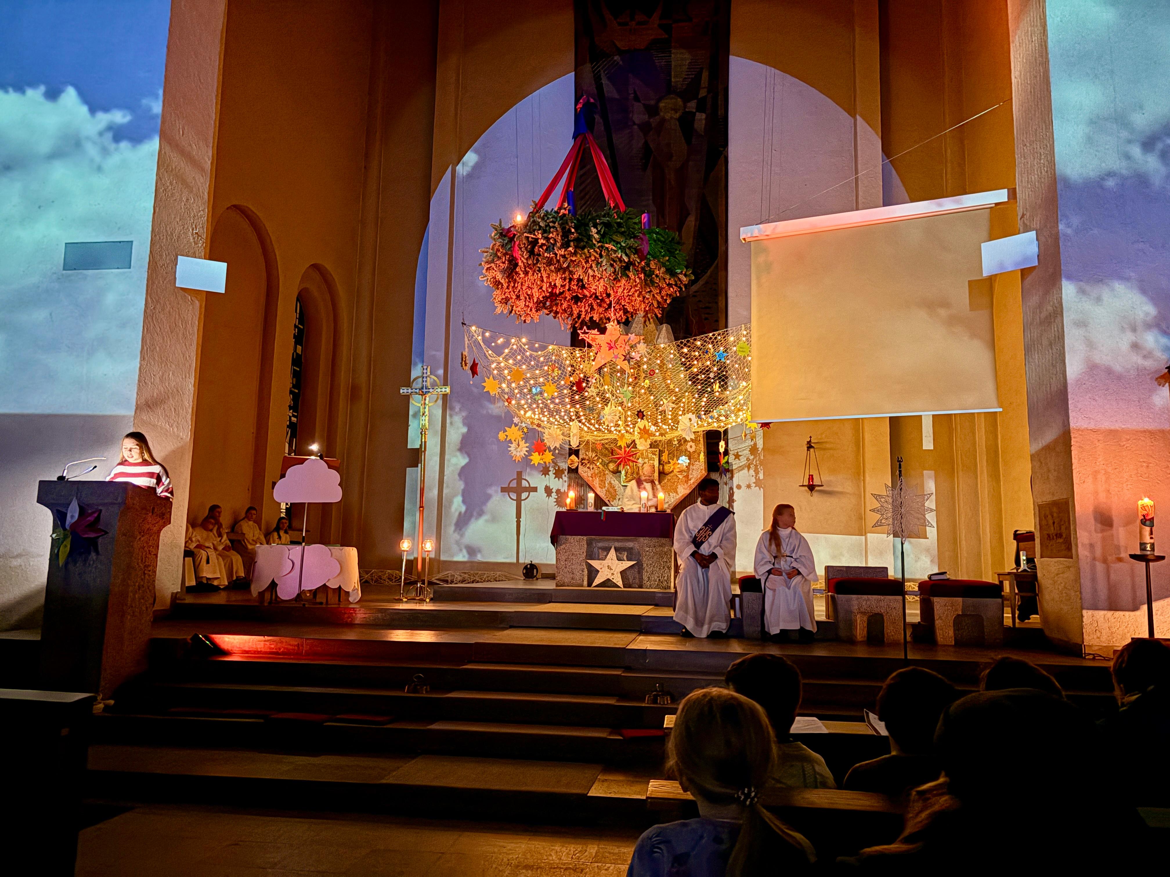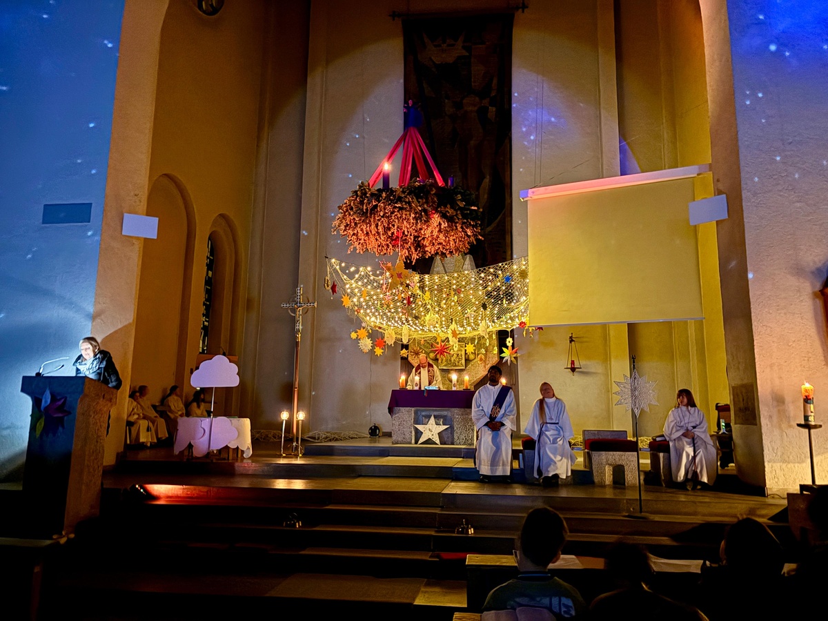 Im Zentrum stand in diesem Jahr der ULFer Sternenhimmel. Über Wochen haben Kinder, Jugendliche, Familien, aber auch Seniorinnen und Senioren Sterne gebastelt, die nun die Advents- und Weihnachtszeit in der Pfarrkirche über dem Altar erstrahlen. Viele haben ihre Stern gefüllt mit Sternstunden ihres Lebens, Hoffnungen und Erwartungen an eine gute Zukunft. Peter Gredel und Klaus Metzler schufen eine geniale Konstruktion, die die Lebenssterne nun über dem Altar schweben lassen. Eindrucksvoll illuminierte Max Meder Sternenhimmel und Pfarrkirche und intensivierte so das Erleben der hellen Sternennacht.