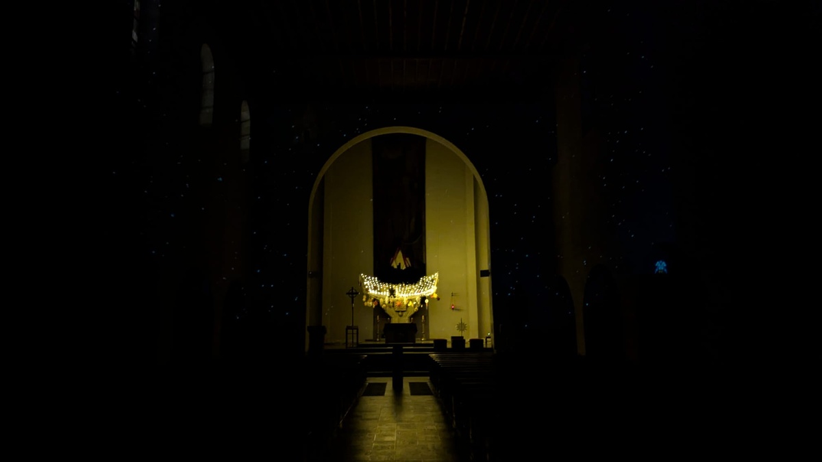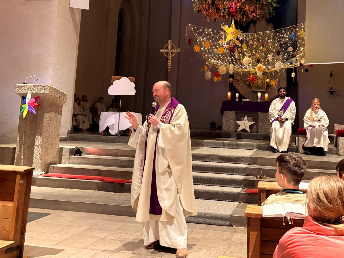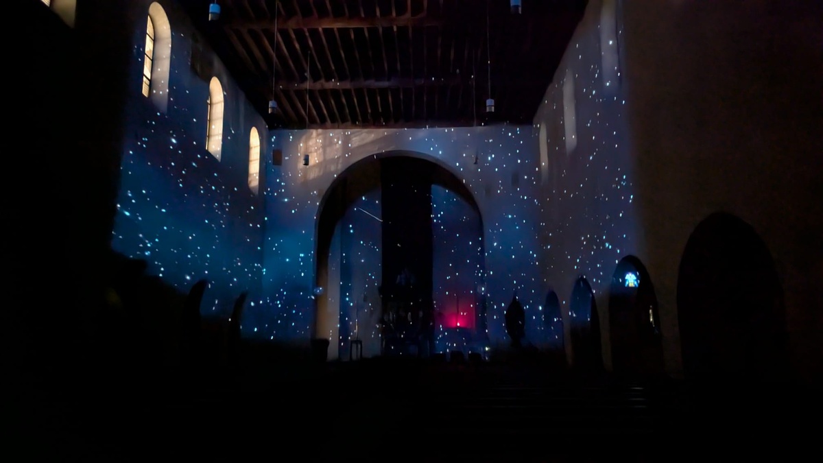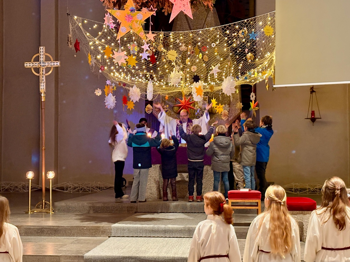 Im Zentrum stand in diesem Jahr der ULFer Sternenhimmel. Über Wochen haben Kinder, Jugendliche, Familien, aber auch Seniorinnen und Senioren Sterne gebastelt, die nun die Advents- und Weihnachtszeit in der Pfarrkirche über dem Altar erstrahlen. Viele haben ihre Stern gefüllt mit Sternstunden ihres Lebens, Hoffnungen und Erwartungen an eine gute Zukunft. Peter Gredel und Klaus Metzler schufen eine geniale Konstruktion, die die Lebenssterne nun über dem Altar schweben lassen. Eindrucksvoll illuminierte Max Meder Sternenhimmel und Pfarrkirche und intensivierte so das Erleben der hellen Sternennacht.