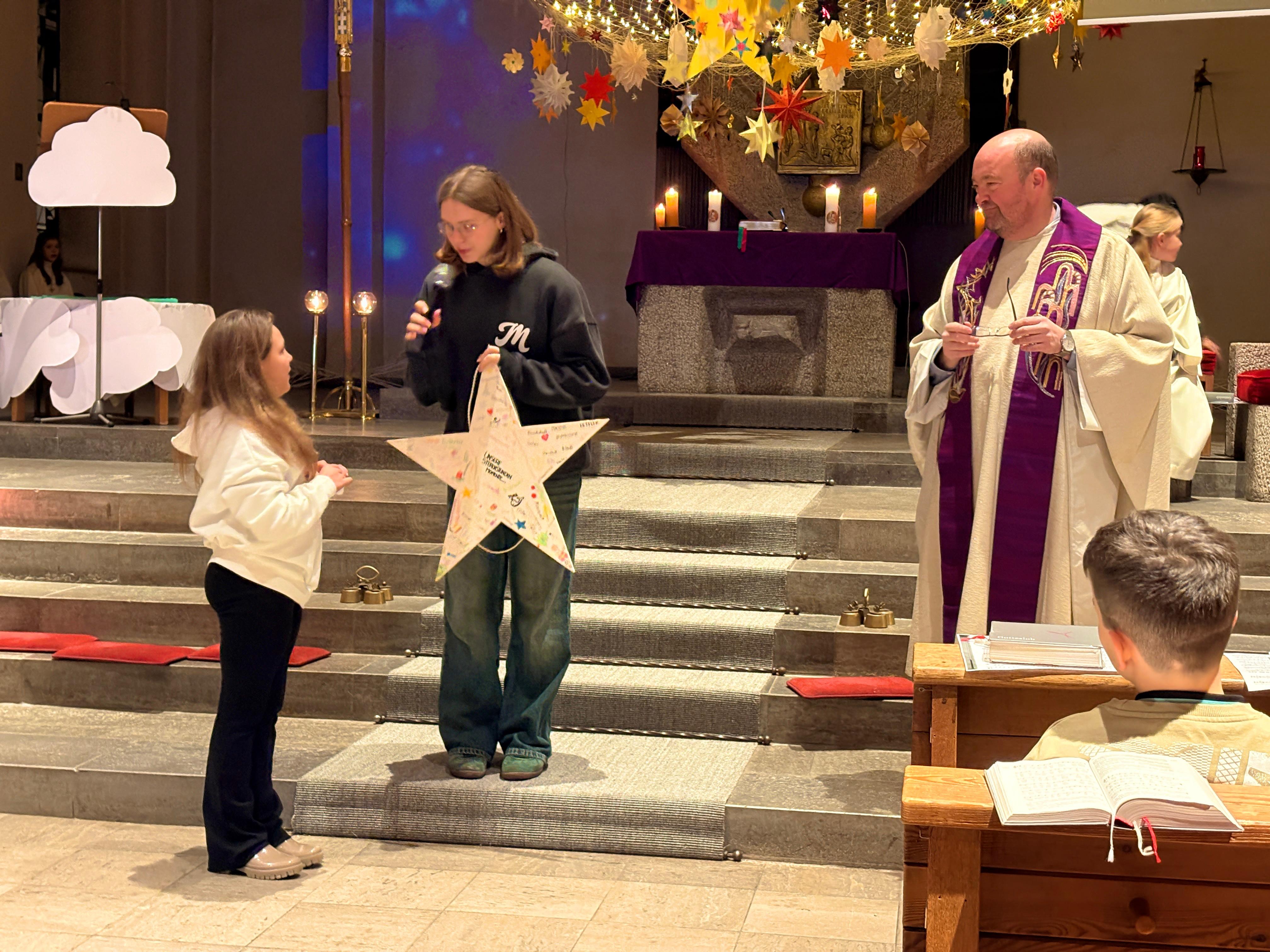 Ihren Stern, der nun auch im Chorraum hängt, gestalteten die Jugendlichen zu Hoffnungen und Wünschen für eine lebenswerte Zukunft. Die Sehnsucht nach Frieden und guten Chancen für die Zukunft standen dabei im Mittelpunkt.