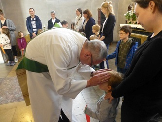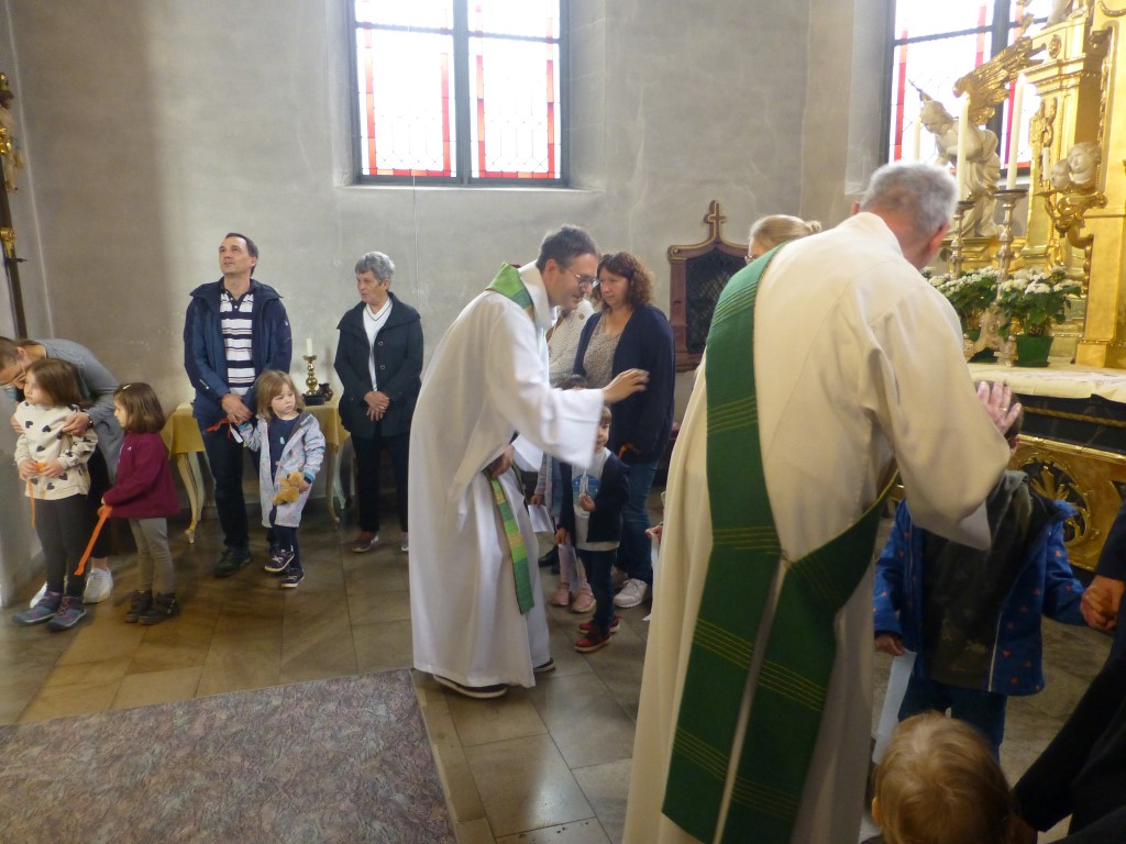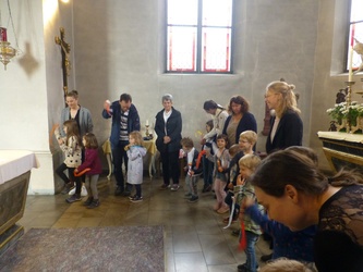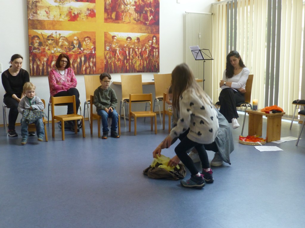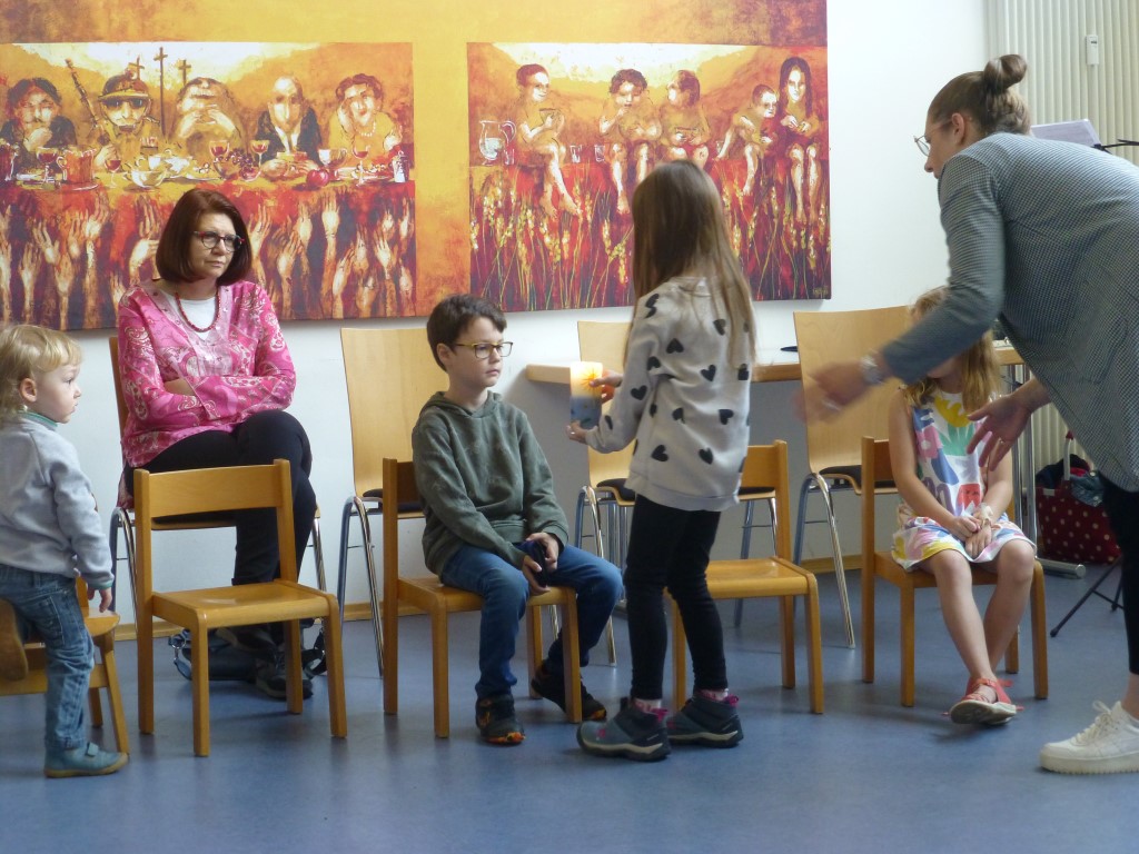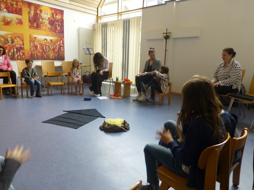Wir erinnerten uns an unsere letzten Kindergottesdienste, als wir mit Jesus seinen Kreuzweg gegangen sind und wie Jesus nach seiner Auferstehung den Emmaus-Jüngern erschienen ist. Aber wie ging es dann weiter? Davon hörten wir am Sonntag. Jesus hat seinen Freunden versprochen, ihnen Kraft durch den Heiligen Geist zu schenken.