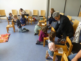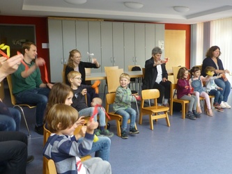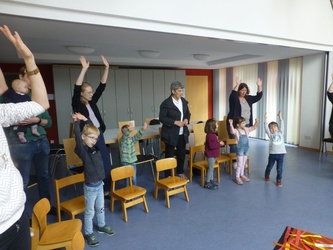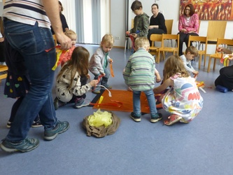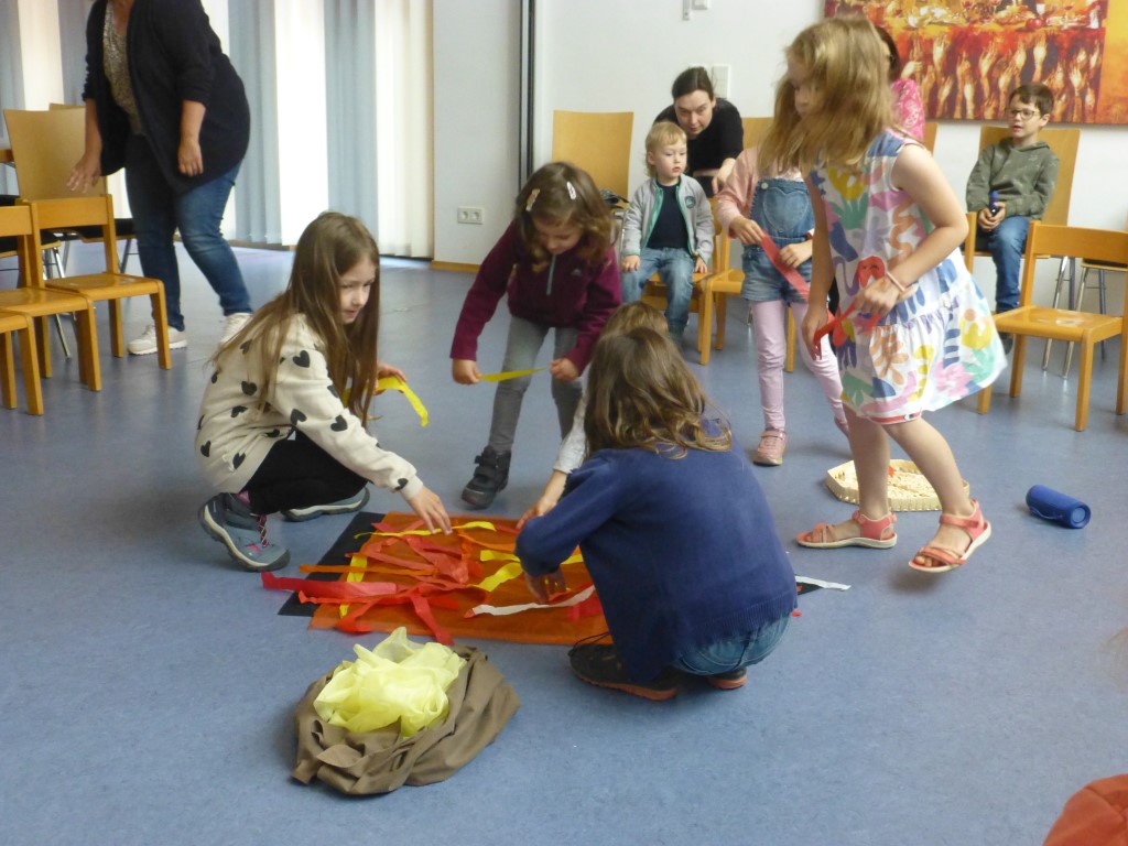 Im Bodenbild legten wir ein Haus, in dem die Jünger in ihrer Trauer versammelt waren. Dunkelheit und Traurigkeit spürten wir nach. Doch dann hörten wir ein lautes Brausen, einen Sturm, der das Haus erfüllt hat. Und wir hörten vom Feuer, das brennt, aber nichts verbrennt. Die Jünger wussten: Gott ist im Sturm und Gott ist im Feuer. Gestärkt durch den Heiligen Geist konnten die Jünger Jesu Auftrag erfüllen: Sie gingen hinaus ohne Angst und erzählten den Menschen von Gott und von Jesus. Auch wir ließen uns von der Freude anstecken. Mit unseren Füßen spielten wir den Sturm, unsere Hände schwenkten Papierfeuerzungen und wir sangen laut: „Am hellen Tag kam Jesu Geist. Alle wissen jetzt, was Freude heißt!“ In Verbundenheit mit allen Freunden Jesu beteten wir das Vater Unser. Anschließend gingen wir zum Segen in die Kirche, wo wir noch einmal mit unseren Feuerzungen das Pfingstgeschehen lebendig werden ließen.