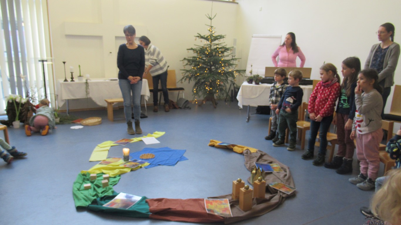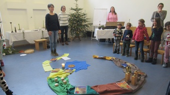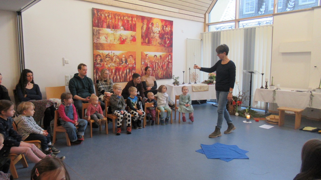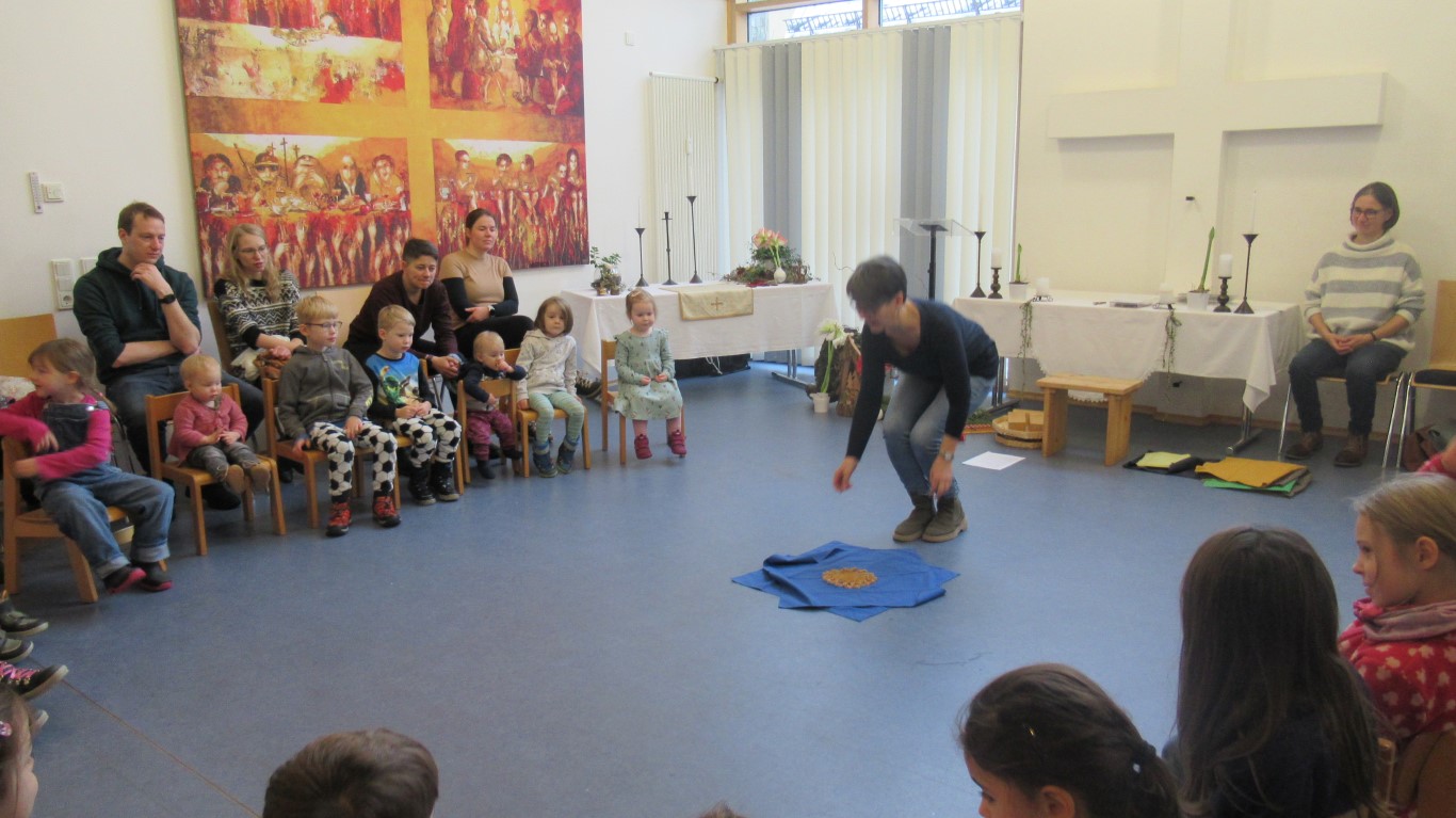 Etwas Verborgenes, eingehüllt in ein blaues Tuch, lag in der Mitte. Ein großer Stern kam zum Vorschein. Der Stern scheint etwas Besonderes zu sein: Leuchtend am Nachthimmel wanderte der Stern. Auch in unserem Kreis zog er seine Bahn. Was verkündet er? Was hat er Großes zu sagen? Was will er uns erzählen?... Wir begleiteten den Stern gemeinsam mit den Sterndeutern einen langen Weg, bis wir fanden, wohin er uns führte. Endlich kamen die Sterndeuter nach langer Zeit in die Stadt Jerusalem zum König Herodes, der um seine Macht fürchtete. Der Stern leuchtete die ganze Zeit und blieb über dem Stall in Betlehem stehen. Sie spürten: Jesus ist etwas Besonderes. In diesem Kind ist Gott uns nahe. Er macht unseren Weg hell und führt uns auf gute Wege. "Der Weihnachtsstern, der weiß den Weg...", ein schönes Lied , das uns durch den Gottesdienst begleitete.