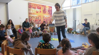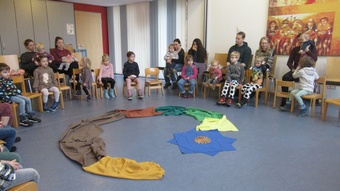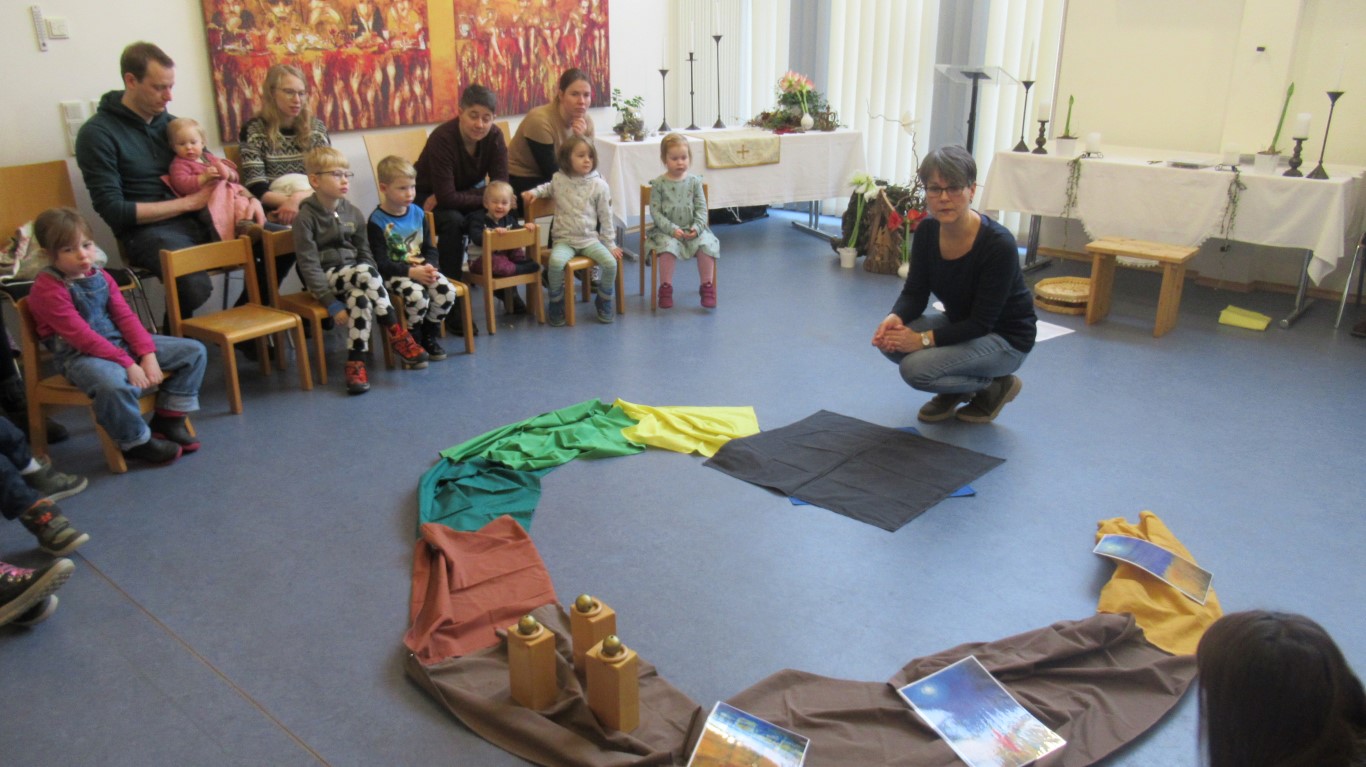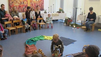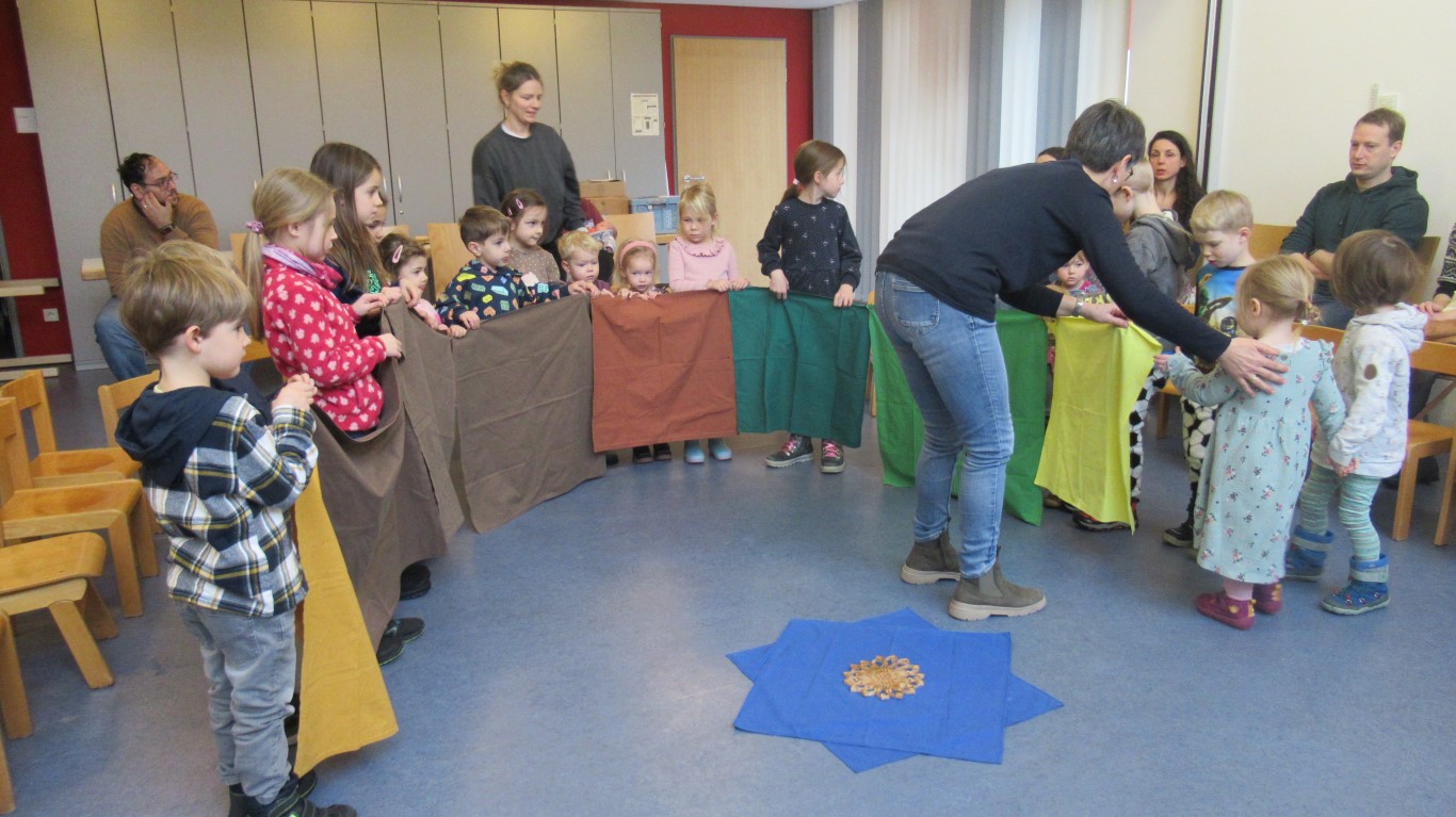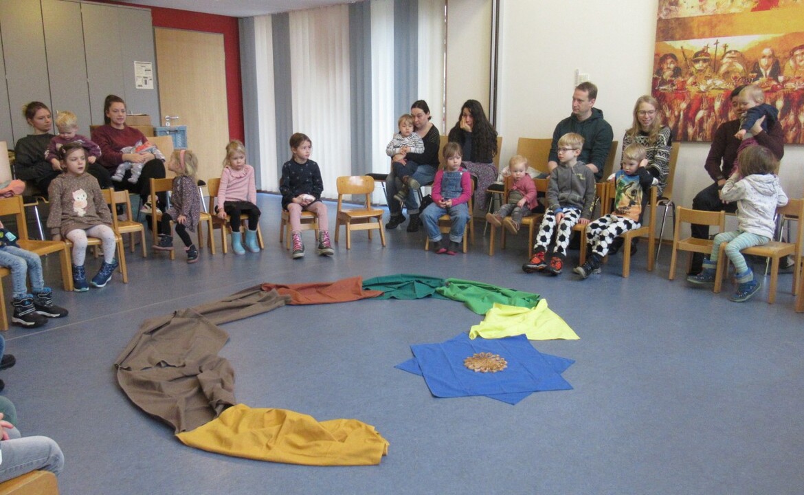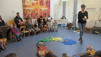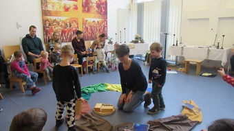 Etwas Verborgenes, eingehüllt in ein blaues Tuch, lag in der Mitte. Ein großer Stern kam zum Vorschein. Der Stern scheint etwas Besonderes zu sein: Leuchtend am Nachthimmel wanderte der Stern. Auch in unserem Kreis zog er seine Bahn. Was verkündet er? Was hat er Großes zu sagen? Was will er uns erzählen?... Wir begleiteten den Stern gemeinsam mit den Sterndeutern einen langen Weg, bis wir fanden, wohin er uns führte. Endlich kamen die Sterndeuter nach langer Zeit in die Stadt Jerusalem zum König Herodes, der um seine Macht fürchtete. Der Stern leuchtete die ganze Zeit und blieb über dem Stall in Betlehem stehen. Sie spürten: Jesus ist etwas Besonderes. In diesem Kind ist Gott uns nahe. Er macht unseren Weg hell und führt uns auf gute Wege. "Der Weihnachtsstern, der weiß den Weg...", ein schönes Lied , das uns durch den Gottesdienst begleitete.