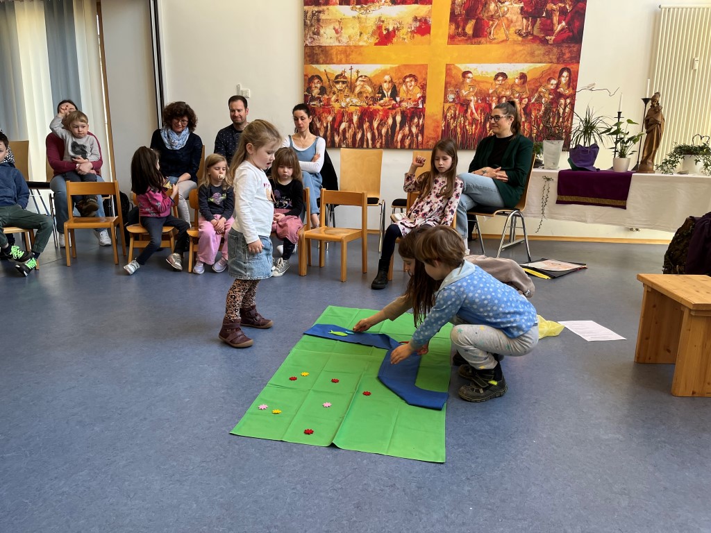 An diesem frühlingshaften Sonntag, freuen wir uns über die schöne Welt, den Sonnenschein, Pflanzen und Tiere, die bereits unterwegs sind. Wir danken Gott für die wunderbare Schöpfung, die heute einmal mehr zu spüren ist. Die Kinder bereiteten eine schöne bunte Landschaft in unserer Mitte auf. Einer kann diese wunderbarte Welt nicht sehen: Bartimäus. Seine Augen sind krank, seine Welt ist dunkel.