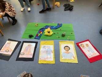 An diesem frühlingshaften Sonntag, freuen wir uns über die schöne Welt, den Sonnenschein, Pflanzen und Tiere, die bereits unterwegs sind. Wir danken Gott für die wunderbare Schöpfung, die heute einmal mehr zu spüren ist. Die Kinder bereiteten eine schöne bunte Landschaft in unserer Mitte auf. Einer kann diese wunderbarte Welt nicht sehen: Bartimäus. Seine Augen sind krank, seine Welt ist dunkel.