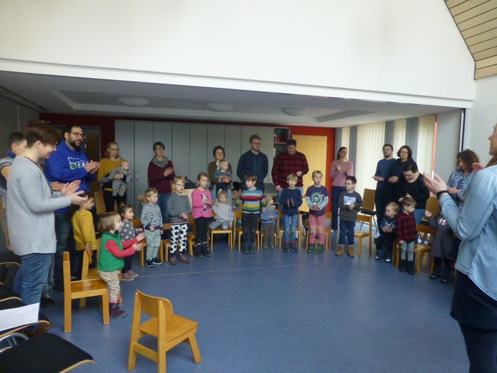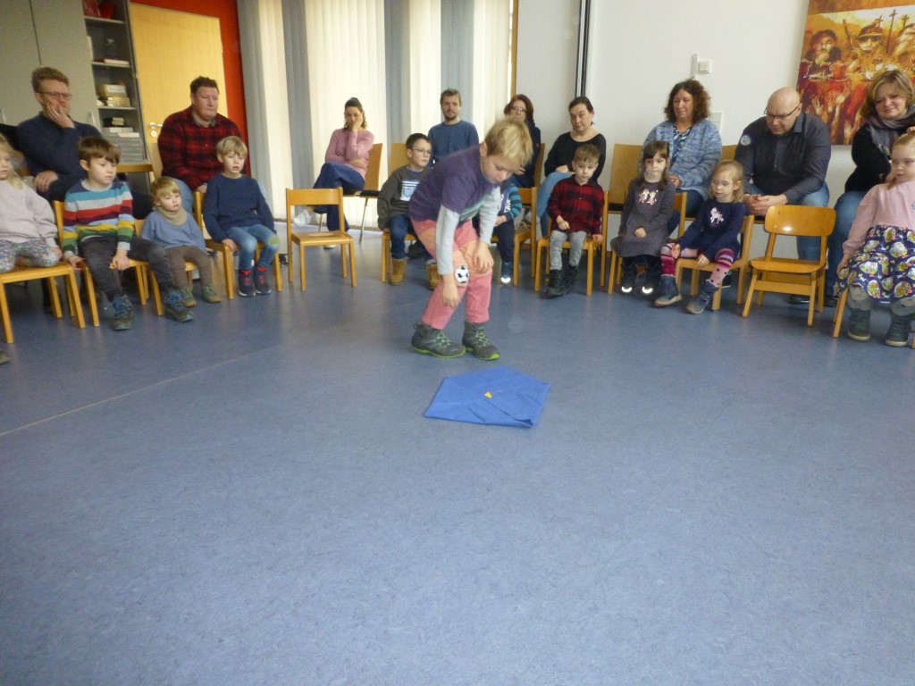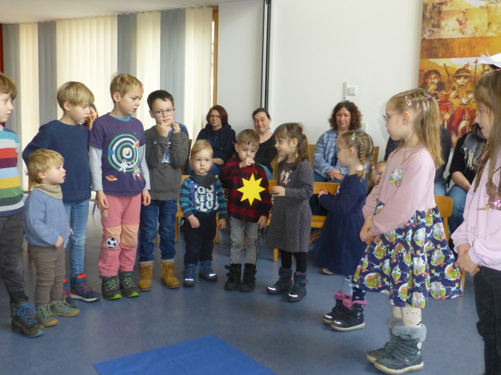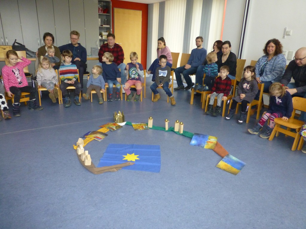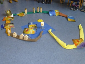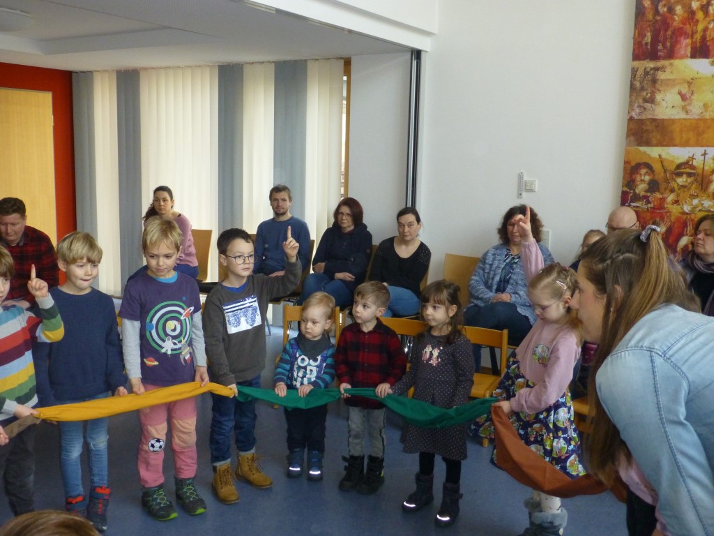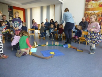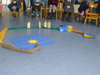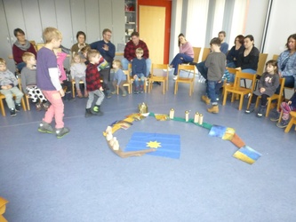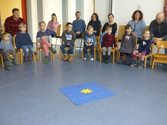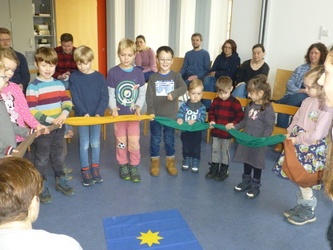 Das Kinderkirchentem lud zur ersten Kinderkirche am Sonntag, 7.1.2024 ein. Etwas Verborgenes, eingehüllt in ein blaues Tuch, fand in unserer Mitte Platz. Ein großer Stern, leuchtend am Nachthimmel wanderte in unserem Kreis und zog an der Himmelsbahn seinen Weg. Was verkündet er? Was hat er Großes zu sagen? Was will er uns erzählen?... Wir begleiteten den Stern gemeinsam mit den Sterndeutern einen langen Weg, bis wir fanden, wohin er uns führte. Endlich kamen sie nach langer Zeit in die Stadt Jerusalem zum König Herodes, der um seine Macht fürchtete. Der Stern leuchtete die ganze Zeit und blieb über dem Stall in Betlehem stehen. Sie spürten: Jesus ist etwas Besonderes. In diesem Kind ist Gott uns nahe. Er macht unseren Weg hell und führt uns auf gute Wege. "Der Weihnachtsstern, der weiß den Weg..."