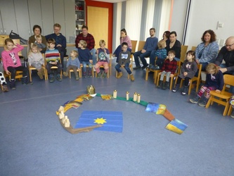 Auf einem anderen Weg ins Morgenlicht machten sich die Weisen aus dem Morgenland auf den Weg nach Hause. Einzelne aussagekräftige Bildszenen fanden im Kreis ihren Platz. Mit dem Segen in der Pfarrkirche und einem Ausalbild für die Kinder endete die Kinderkirche.