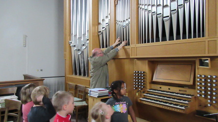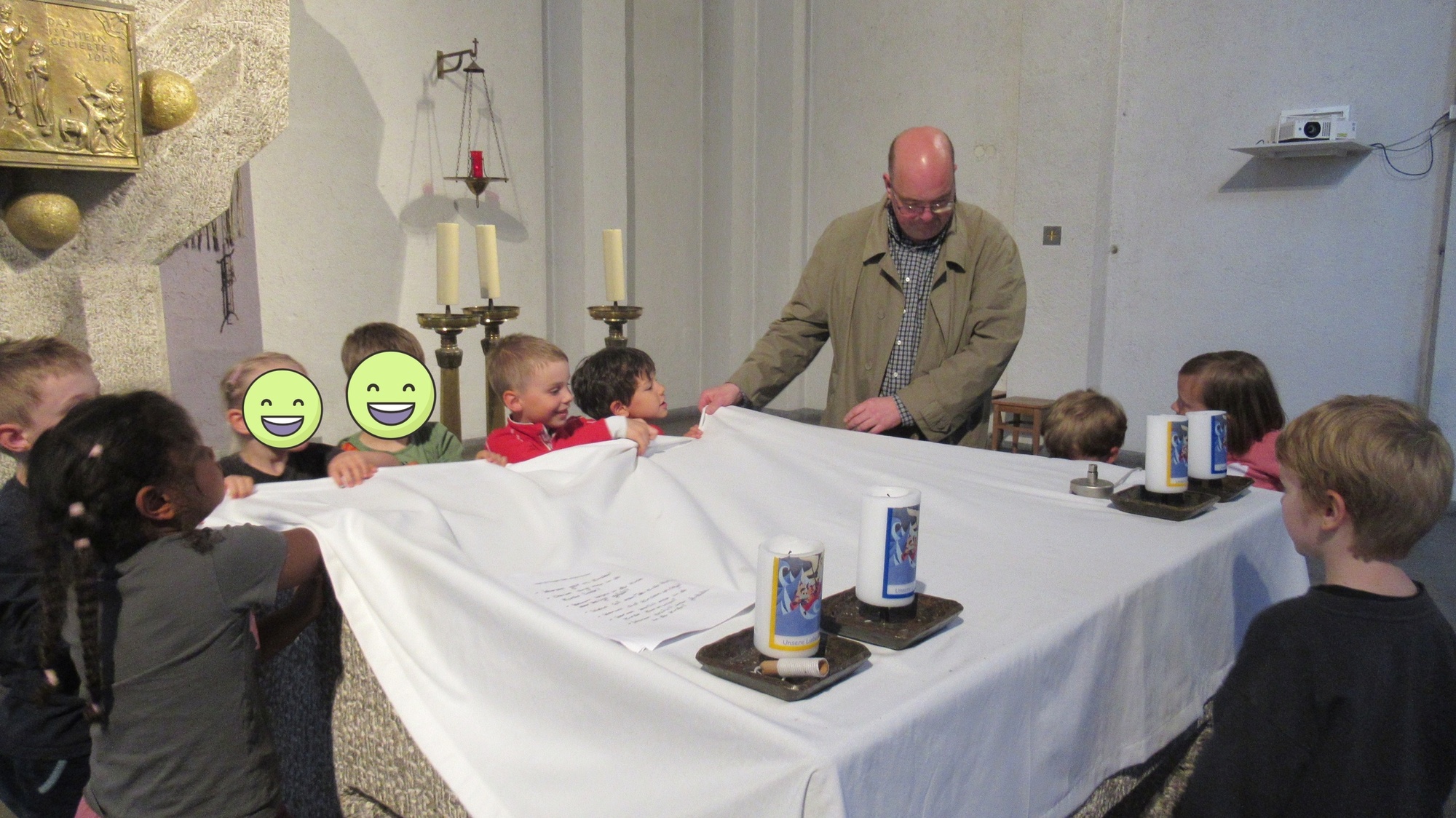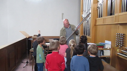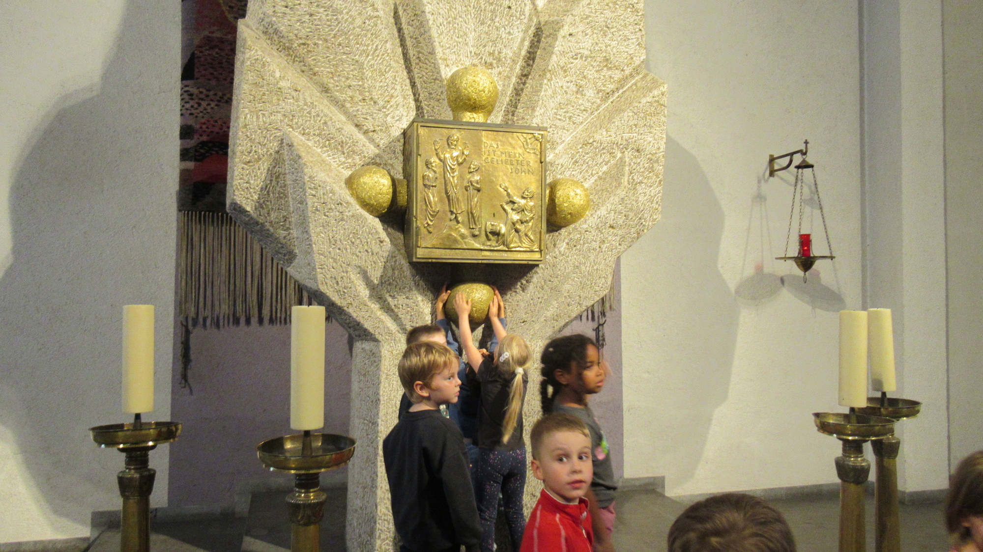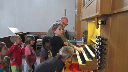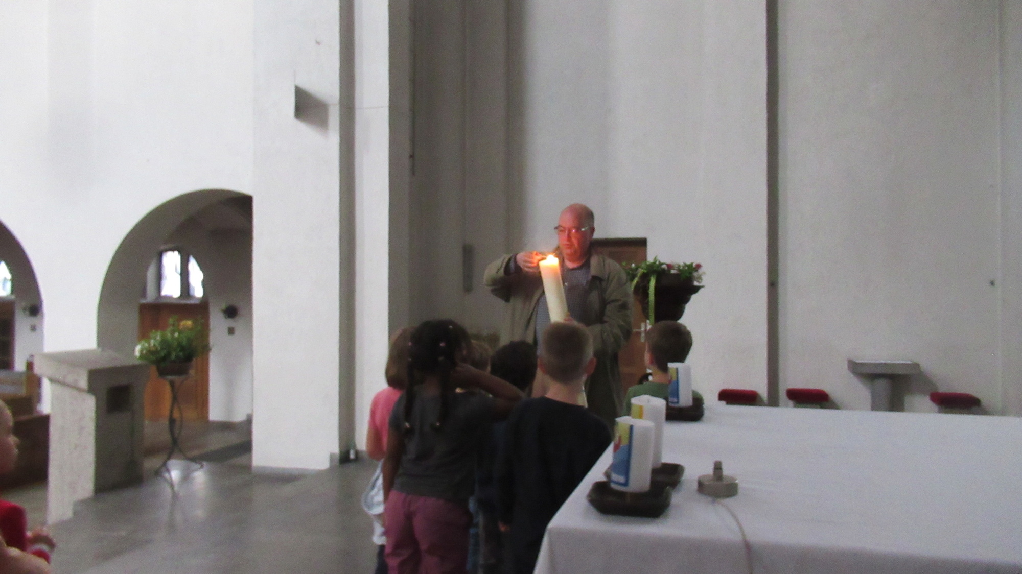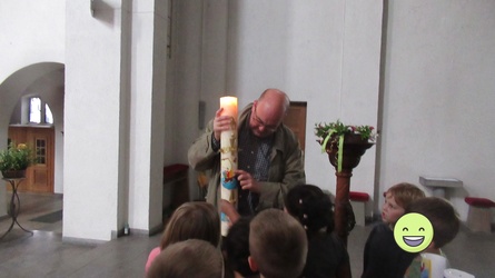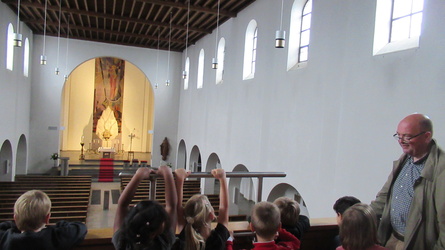 Gemeinsam erkundeten wir die ganze Kirche vom „Tresor“ – zum Taufstein, wir probierten die große Orgel aus, ließen die Glocken läuten … entzündeten die Osterkerze.