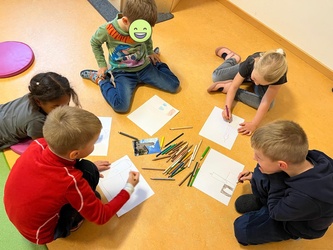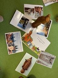 Zunächst schauten wir anhand von Bildern über die Dächer von Würzburg und sahen, es gibt sehr viele Kirchen. Einige sind den Kindern bereits bekannt, wie der Dom oder die Marienkapelle beispielsweise. Alle Kirchen haben einen Kirchenpatron. Unsere Kirche und unser Kindergarten sind Maria geweiht: „Unsere Liebe Frau“ Die Kinder bauten die Kirche nach und malten die Kirche aus ihrem Blickwinkel.