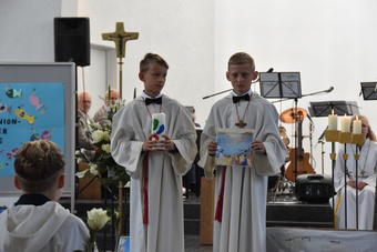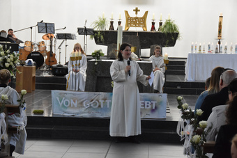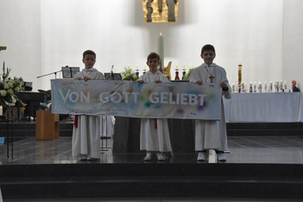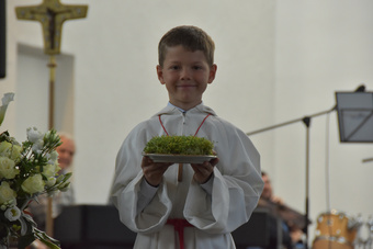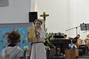 Während der Predigt zeigten die Kommunionkinder einige Gegenstände, die sie in ihrer Kommunionvorbereitung begleitet hatten, wie ein großes Plakat mit der Aufschrift „Von Gott geliebt“ , ihr Kommunionbuch und ihre Gruppenkerze, sowie die Bibel, aus der wir Jesu Worte hören und angesäte Kresse als Zeichen dafür, dass auch die Freundschaft mit Jesus Pflege braucht, damit sie wachsen kann.