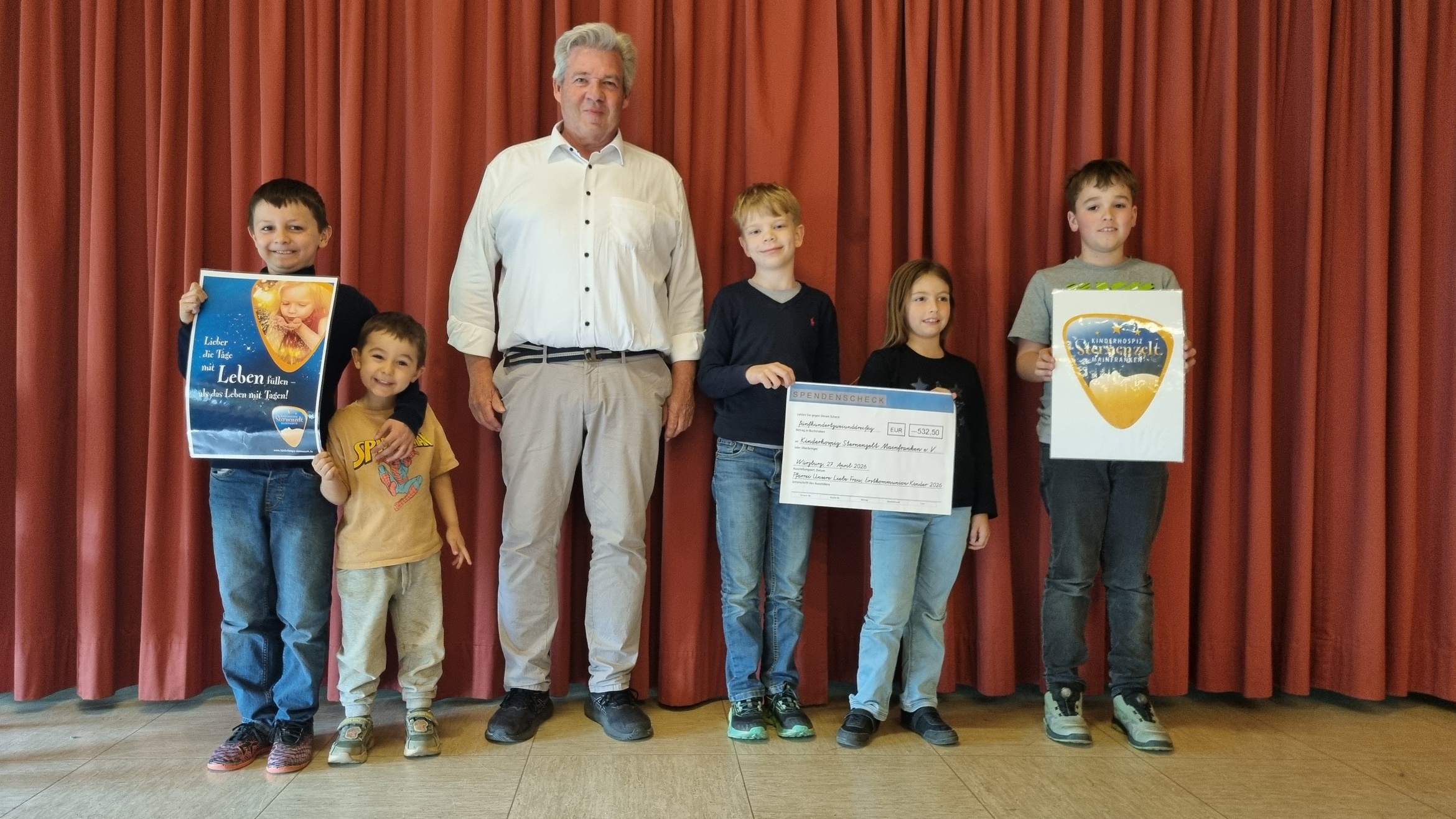 "Toll, dass ihr an uns gedacht habt", lobte Stefan Zöller, Geschäftsführer des Kinderhospizes Sternenzelt, die Kommunionkinder auf ULF und St. Barbara. Jedes Jahr sammeln die Kinder am Weißen Montag Spenden für soziale Projekte. In diesem Jahr wählten sie die Kindertafel in der St. Barbarastraße und das Kinderhospiz Sternenzelt, das seinen Sitz in Marktheidenfeld hat, aber zugleich in ganz Unterfranken tätig ist, aus. Herr Zöller nahm sich die Zeit und erklärte den Kindern die Ziele von Sternenzelt. Seit mehr als 15 Jahren begleiten Ehrenamtliche Familien mit Kindern, die unheilbar krank sind. Das ambulante Kinderhospiz betreut mehr als 40 Familien in Unterfranken, gibt Hilfe für die Eltern, schenkt Trost und kümmert sich v.a. auch um Geschwisterkinder, so dass in Krisenzeiten doch noch glückliche Tage möglich sind. Immer neue Ideen entwickelt der Verein, um den Familien nahe zu sein und helfen zu können. So gibt es mittlerweile auch ein Haus der Begnung mit großem Spielbereich. Die Spende der Kinder hilft für Anschaffungen, aber auch für die Ausbildung von ehrenamltichen Begleiterinnen.