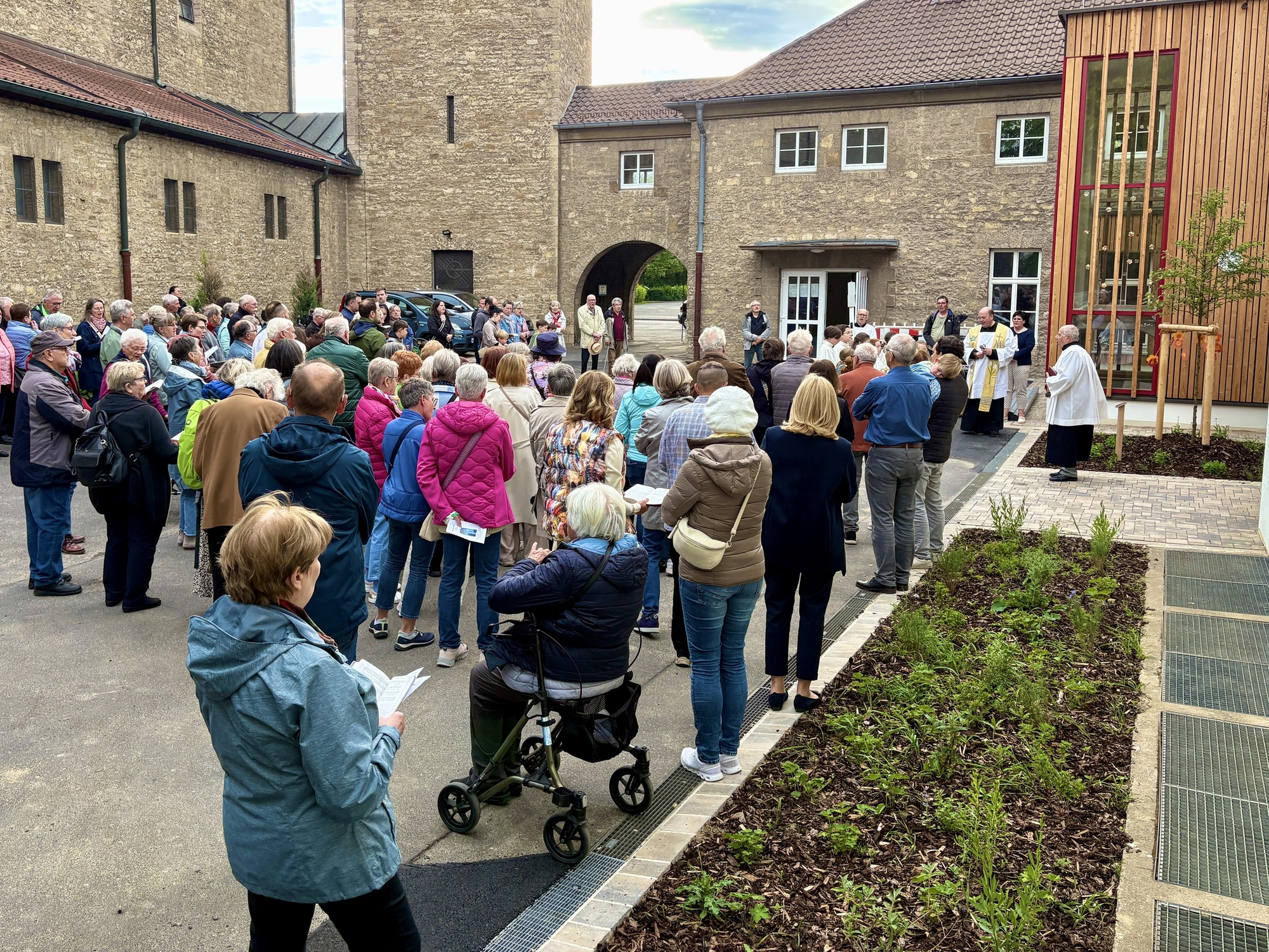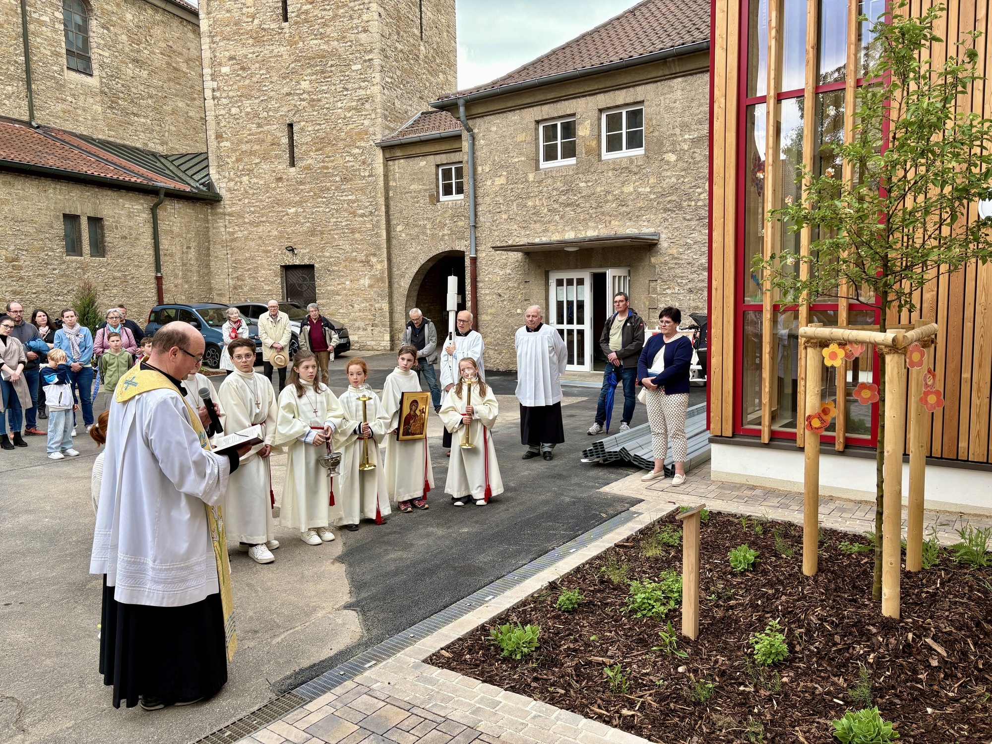 Ein schöner Platz mitten im Pfarrhof für das noch kleine Zierapfelbäumchen. Pfr. Sven Johannsen segnete das Bäumchen. „Möge die Straße … und bis wir uns Wiedersehen, halte Gotte dich fest in seiner Hand…“