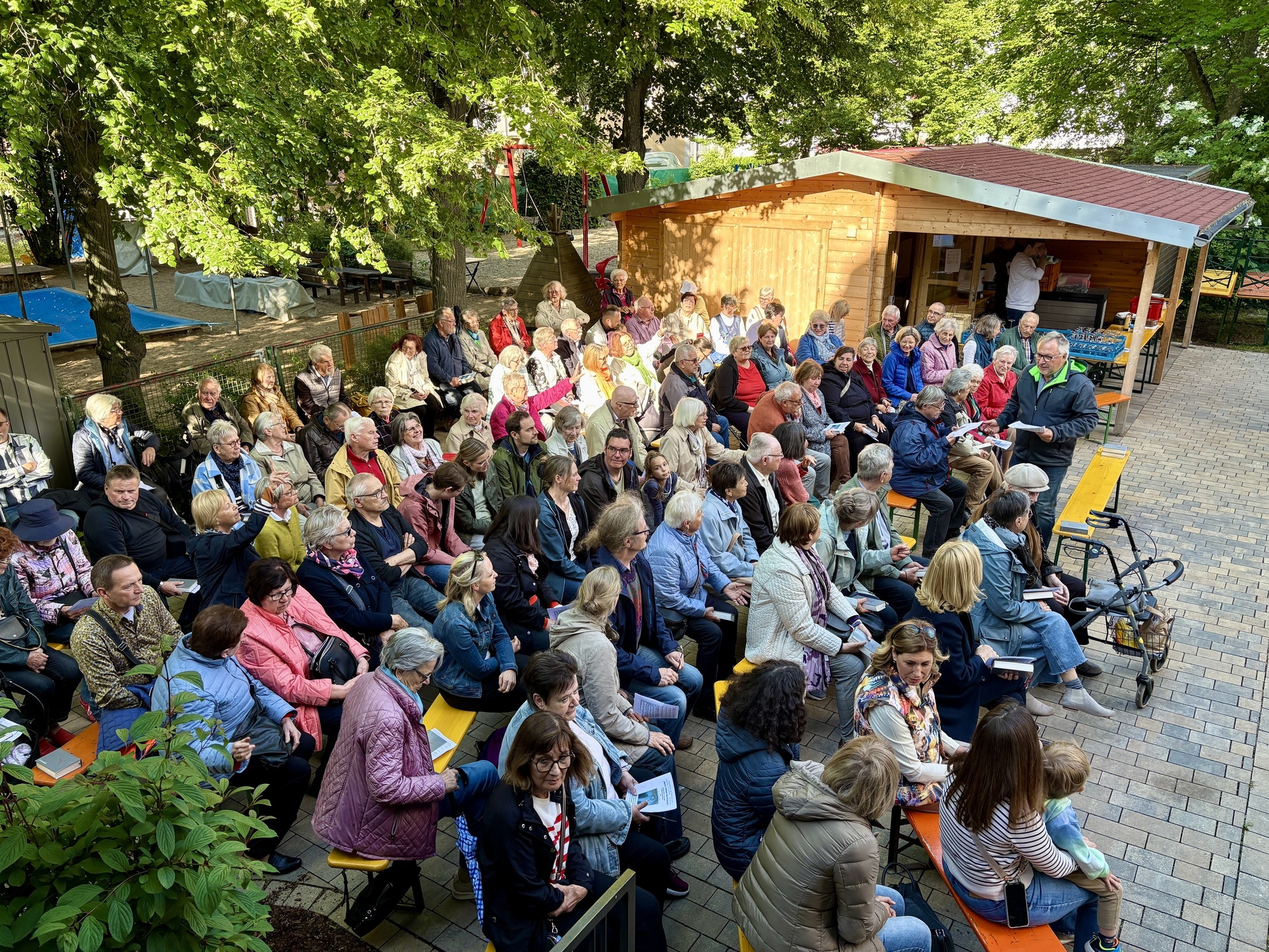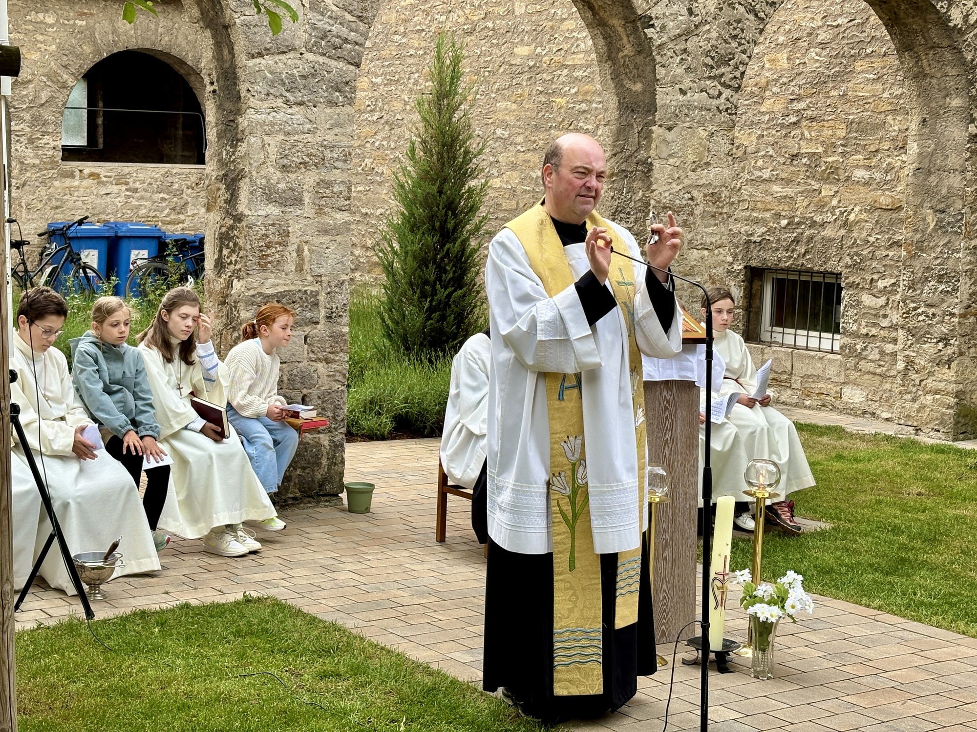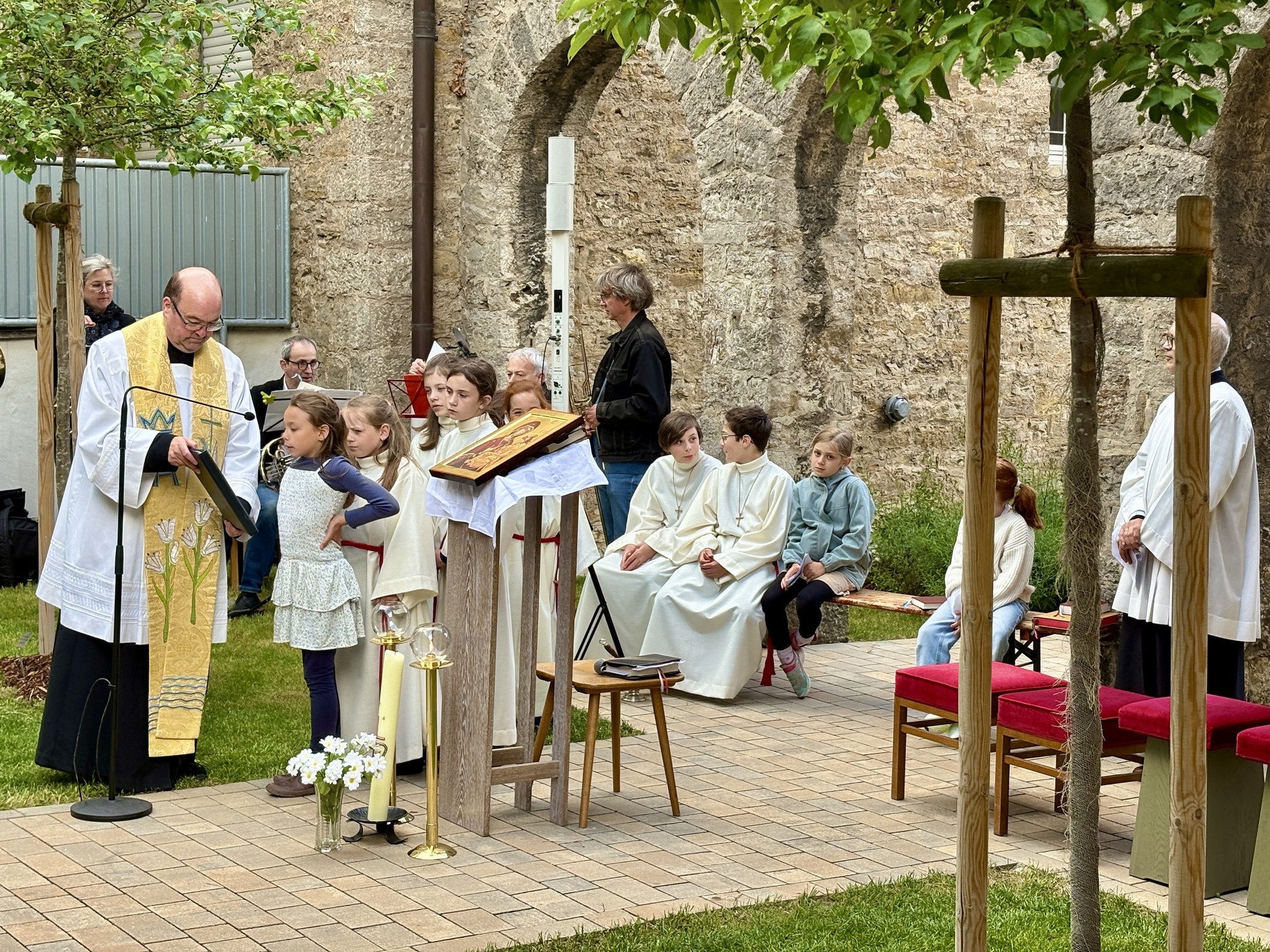 Trotz schlecht gemeldeter Wetterprognosen konnte in diesem schön gestalteten Teil des Pfarrhofes alle Vorbereitungen für die Mainandacht und dem anschließenden Dämmerschoppen vorbereitet werden.